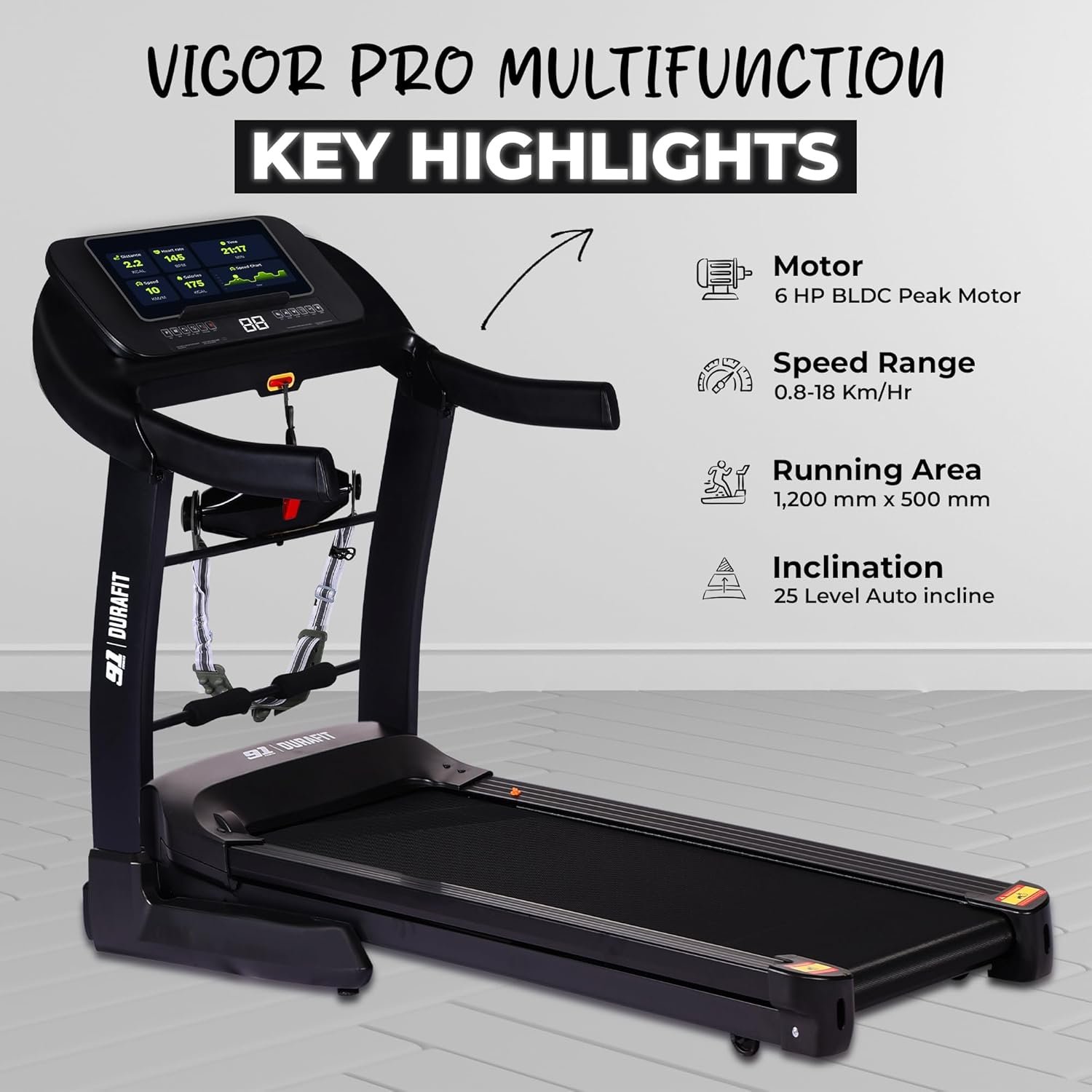 91-Durafit Vigor Pro Multifunction 6 HP Peak BLDC Hydraulic Foldable Treadmill | 25 Level Auto Incline |18 Km/HrMax Speed | Max User Weight 150 Kg | Bluetooth Speaker | Wynd app |Home use