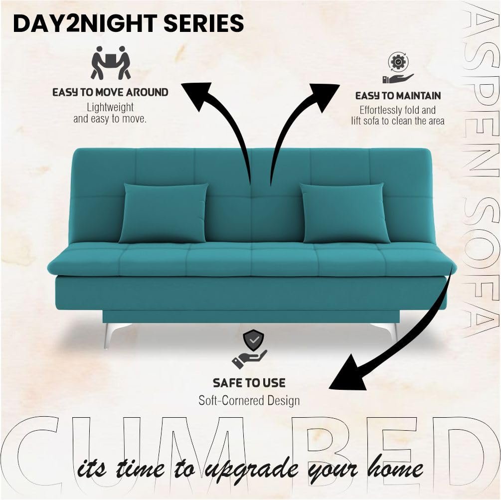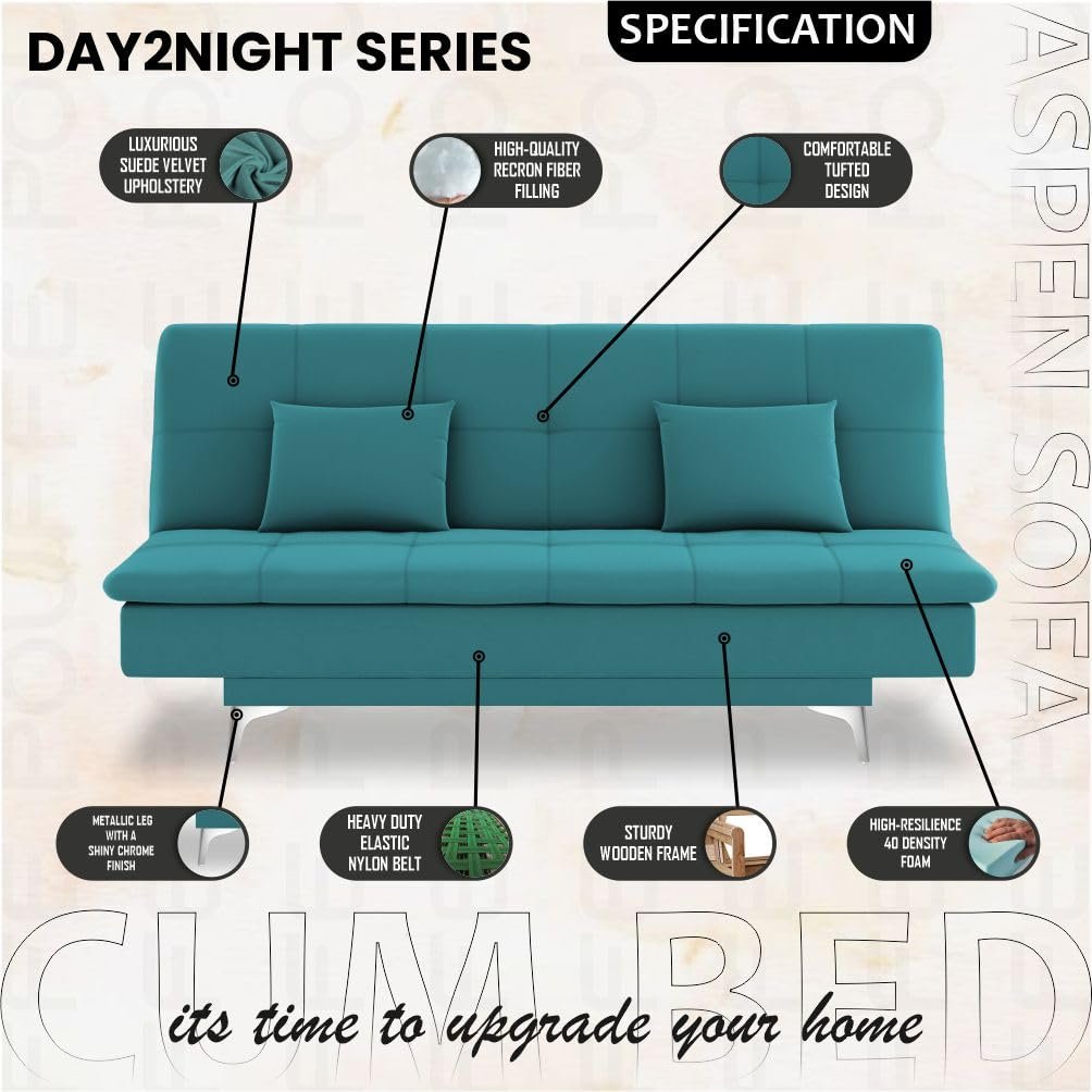 Adorn India Premium New Aspen 3 Seater Sofa Cum Bed 4X6 Velvet Suede with 2 Cushions (Color Aqua Blue) and Suitable for All Indoor, with 3 Years Warranty