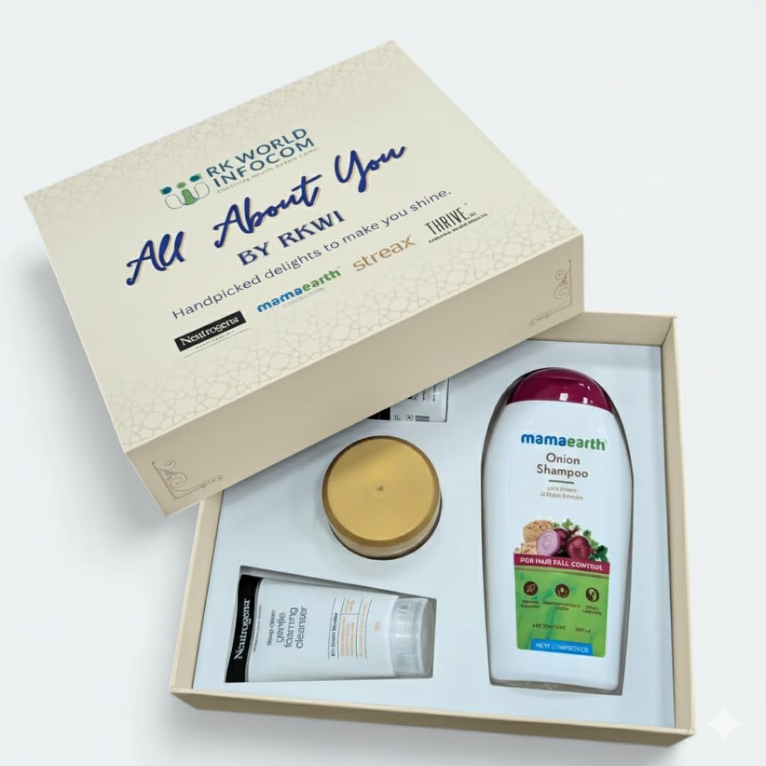 All About You by RKWI- Complete Self Care Gift Box with Thrive Co. Underarm Roll On, Streax Hair Mask, Mamaearth Onion Shampoo & Neutrogena Face Wash