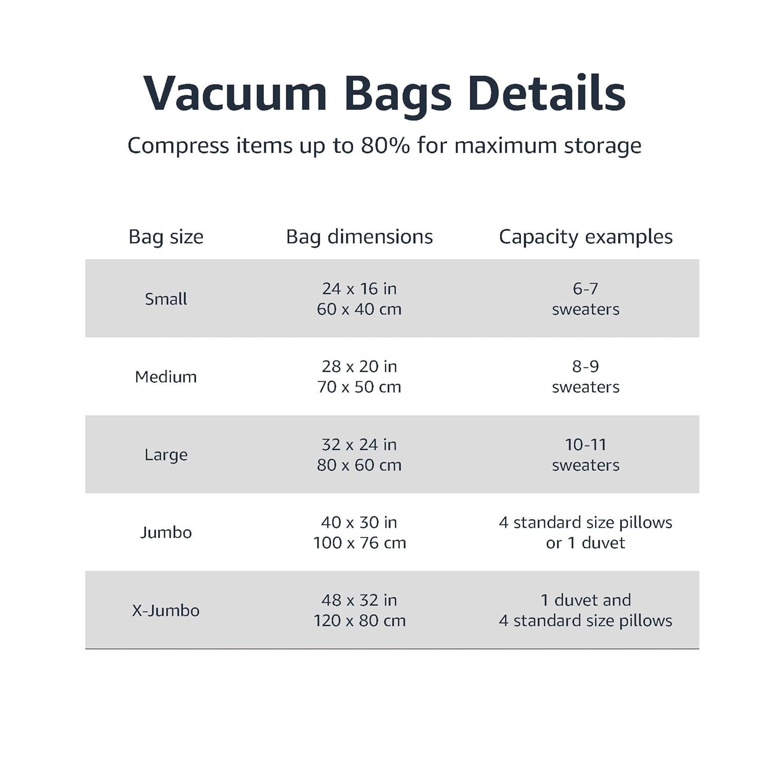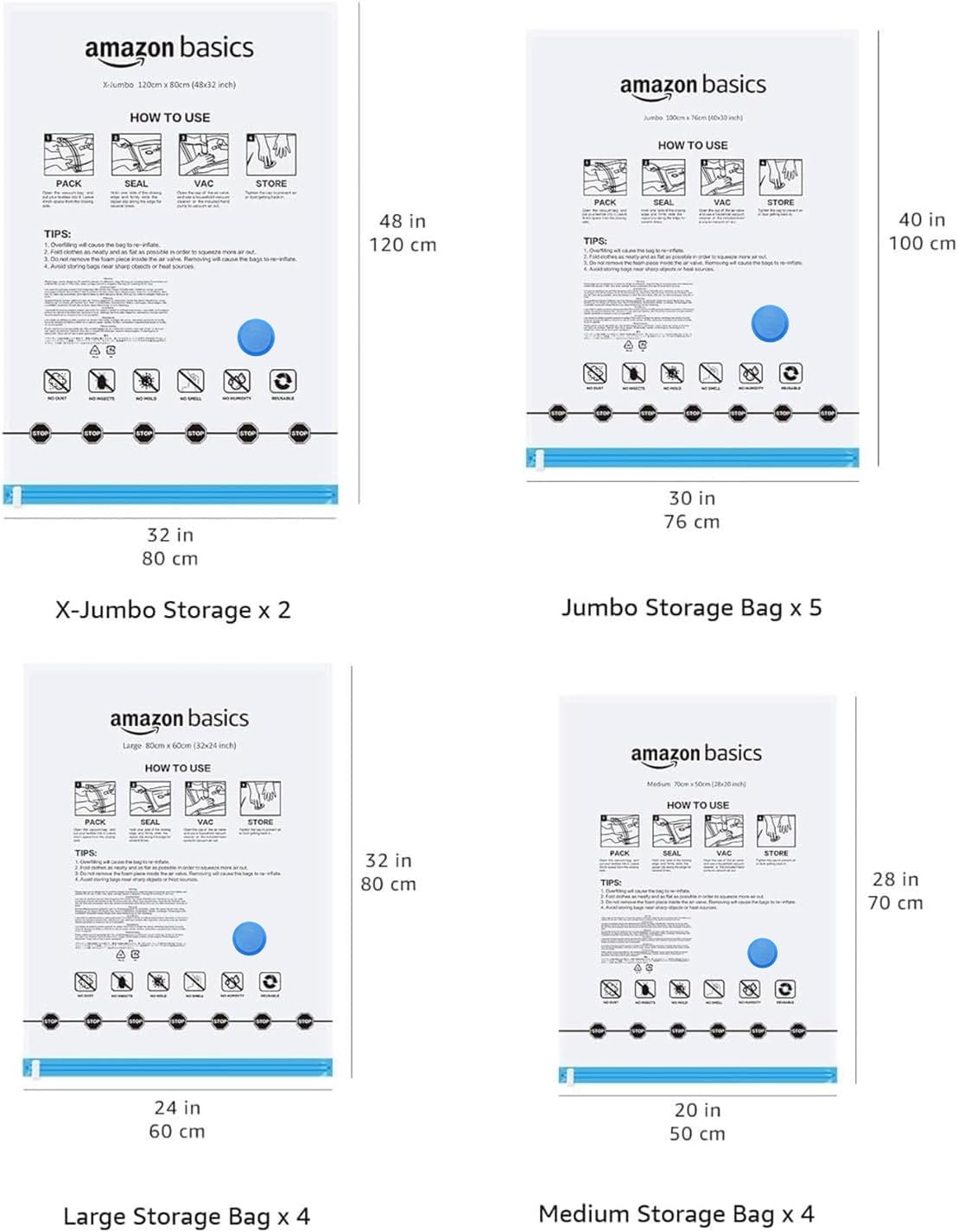 amazon basics Plastic Vacuum Compression Zipper Storage Bags With Hand Pump,20 Pack(5 Small,5 Medium,5 Large&5 Jumbo),Multiple Size,Clear,White
