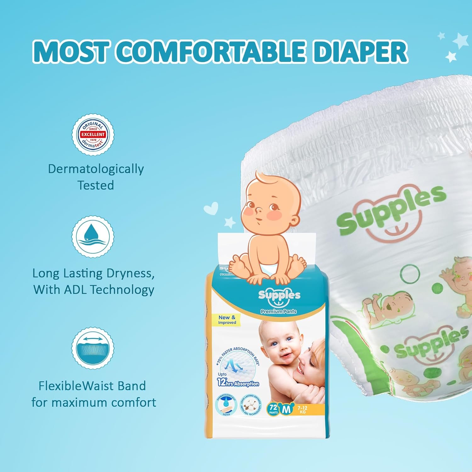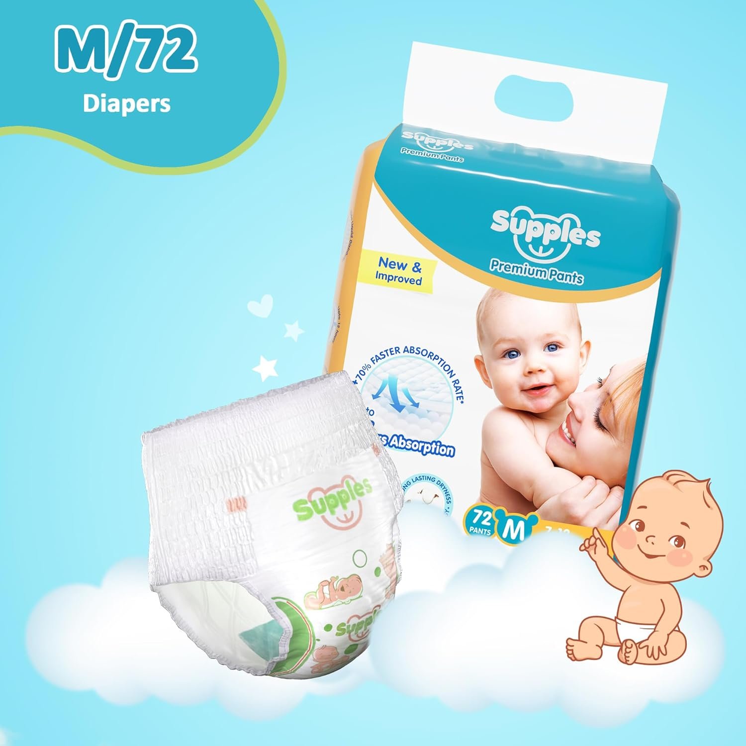 Amazon Brand – Supples Premium Baby Diaper Pants | 72 Baby Diapers | Medium | 7-12 Kg | 12 Hrs Absorption | Cushiony Cotton Soft Fabric | Phthalates-Free | Triple Leak Guard