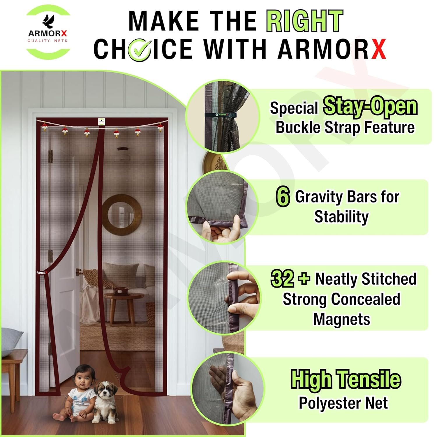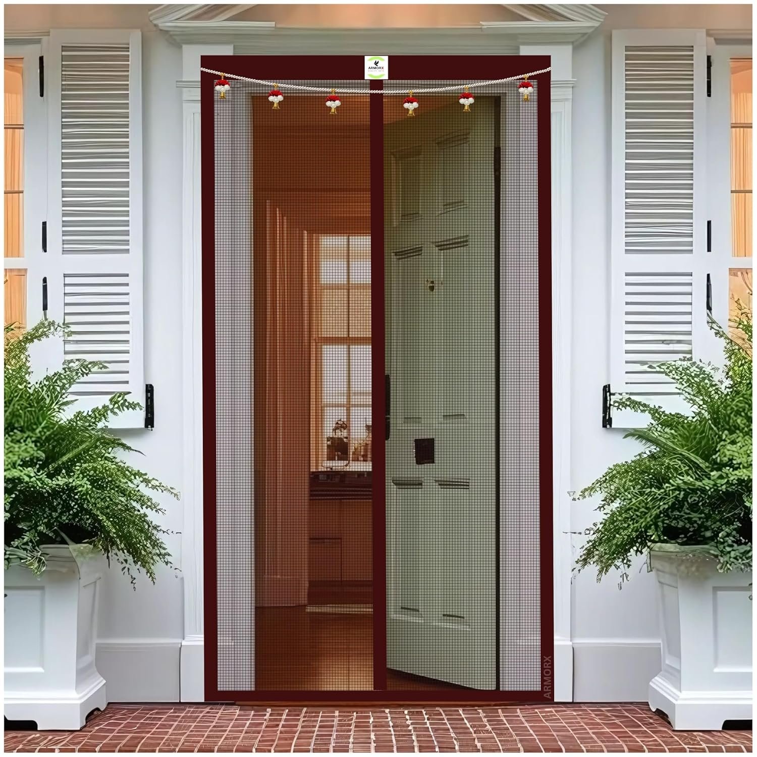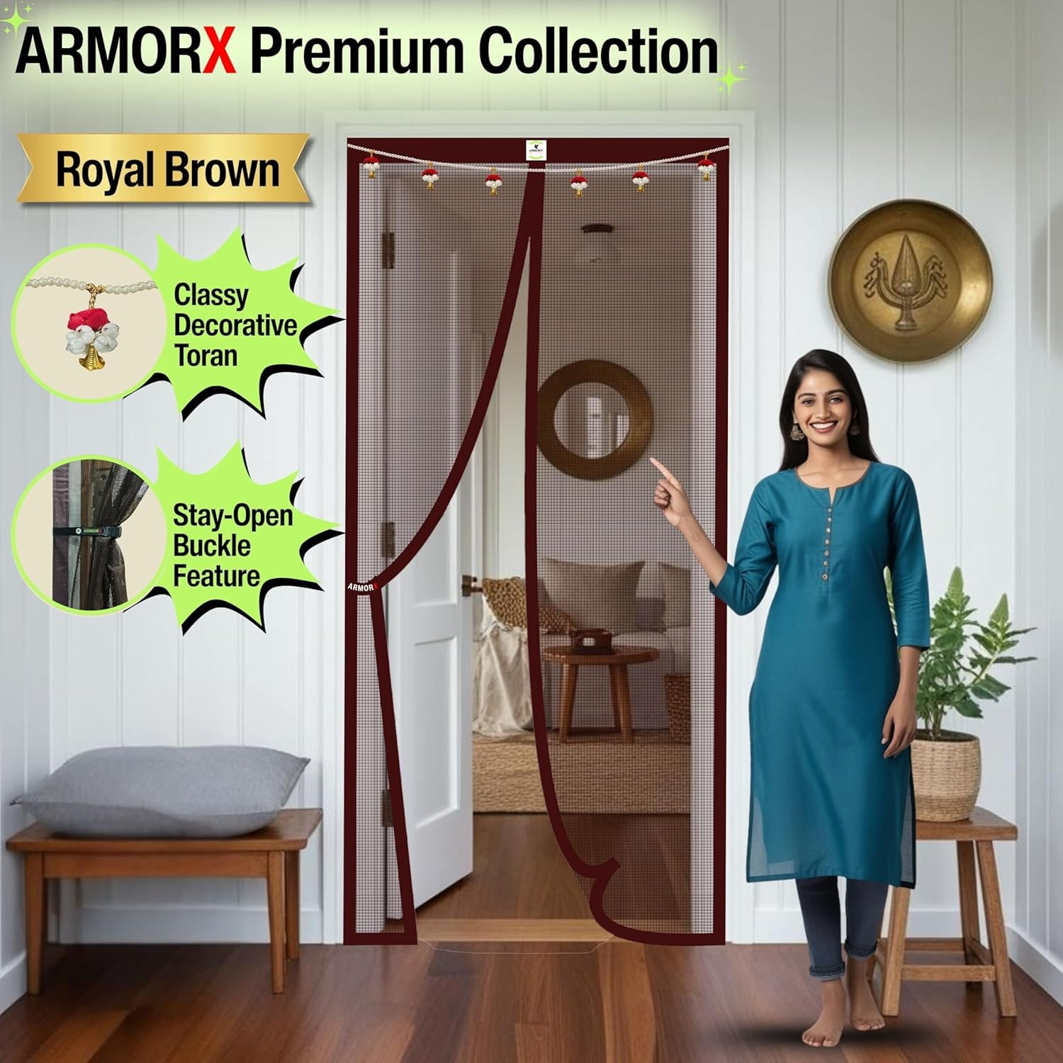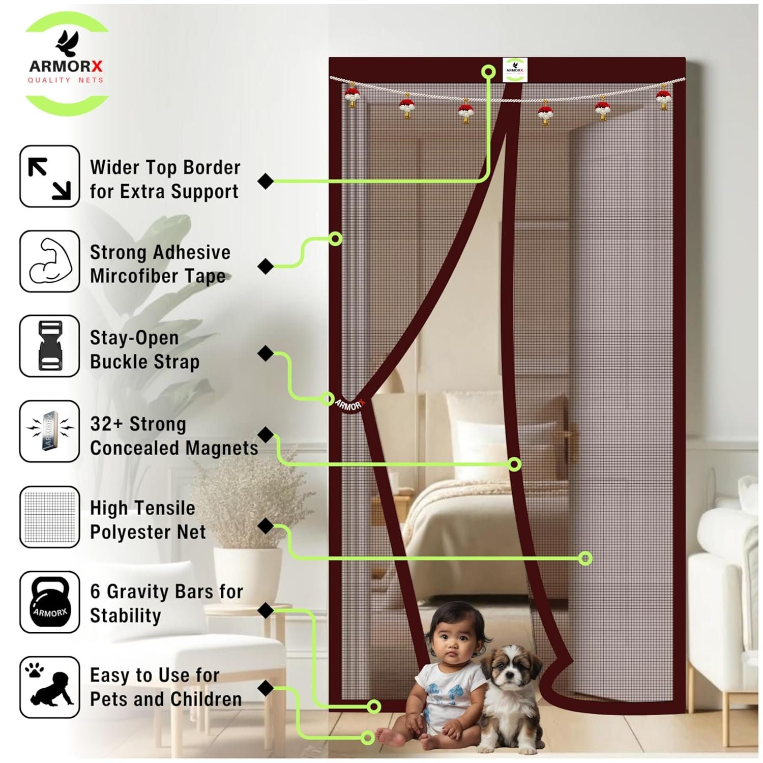 ARMORX Premium Collection Magnetic Mosquito Net for Doors | Self Closing Magnets & Stay-Open Buckle Feature | Incl. Toran for Classy Look & Décor | Royal Brown -200cm x 70cm