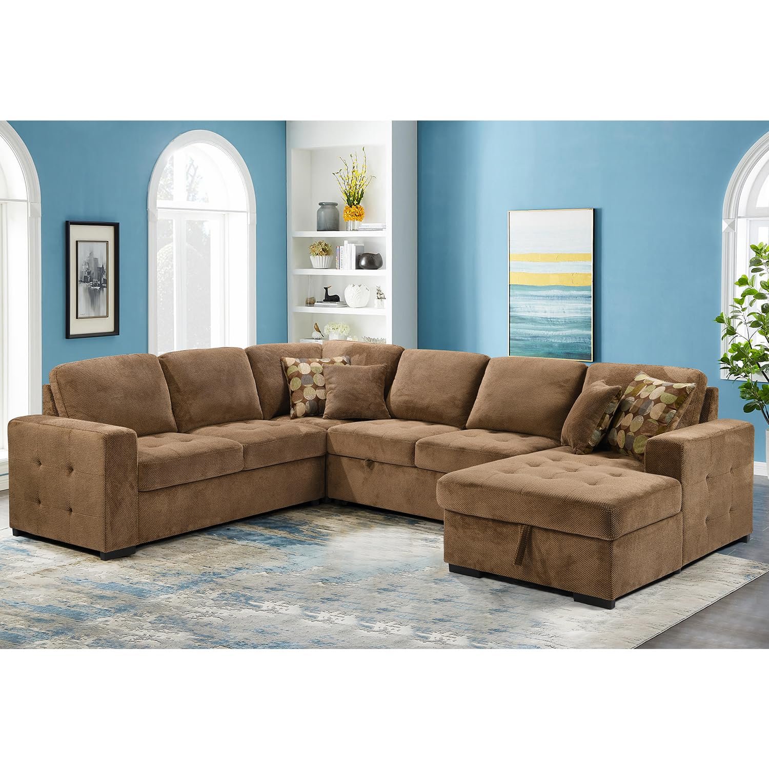 BURRAQUE Sectional Sleeper Sofa with Pull Out Bed and Storage Chaise, U Shape Sectional Sofa Bed, Oversized Sectional Sleeper Couch for Living Room Brown