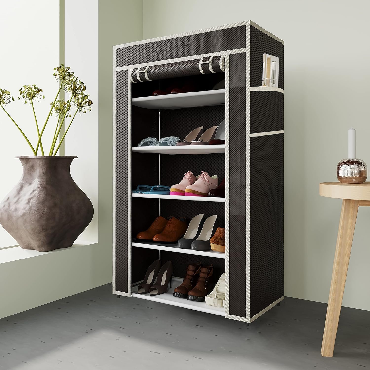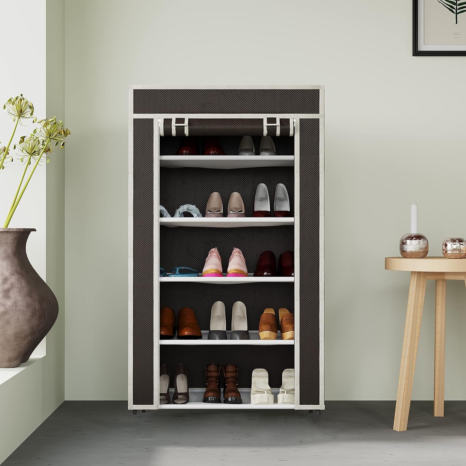 Collapsible Portable Foldable Wardrobe Storage Shelves Organizer for Clothes Racks Fabric Almirah Non Rustable Iron Storage Unit (5 Layer) (Brown)