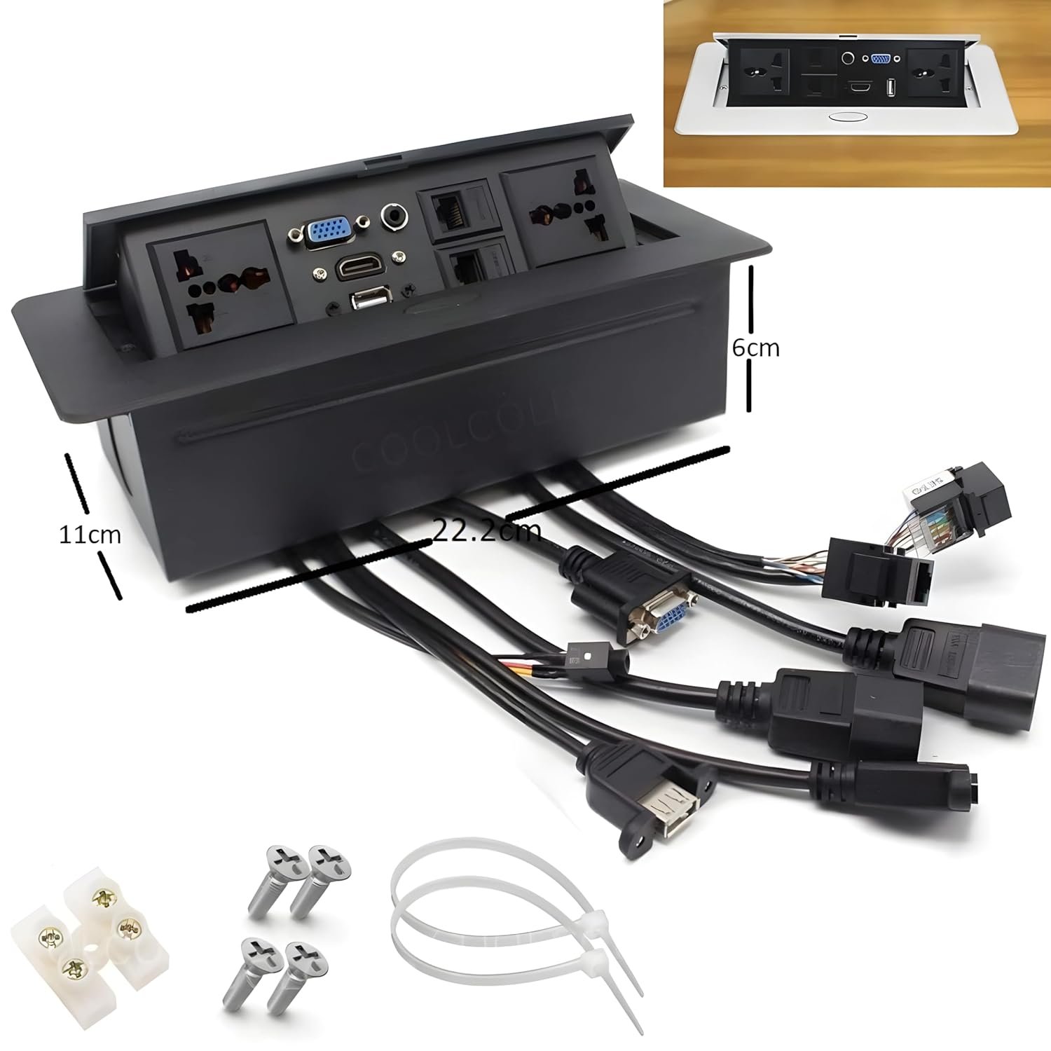 COOLCOLD 10 Module, Hydraulic Cable Cubby, Conference Table Connectivity Solutions, Pop Up Box with HDMI, VGA, Audio, LAN, Power Ports & USB Port (Black) – 1 Year Warranty