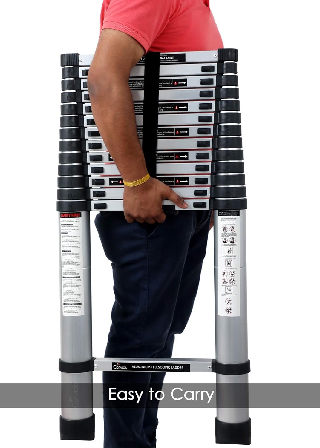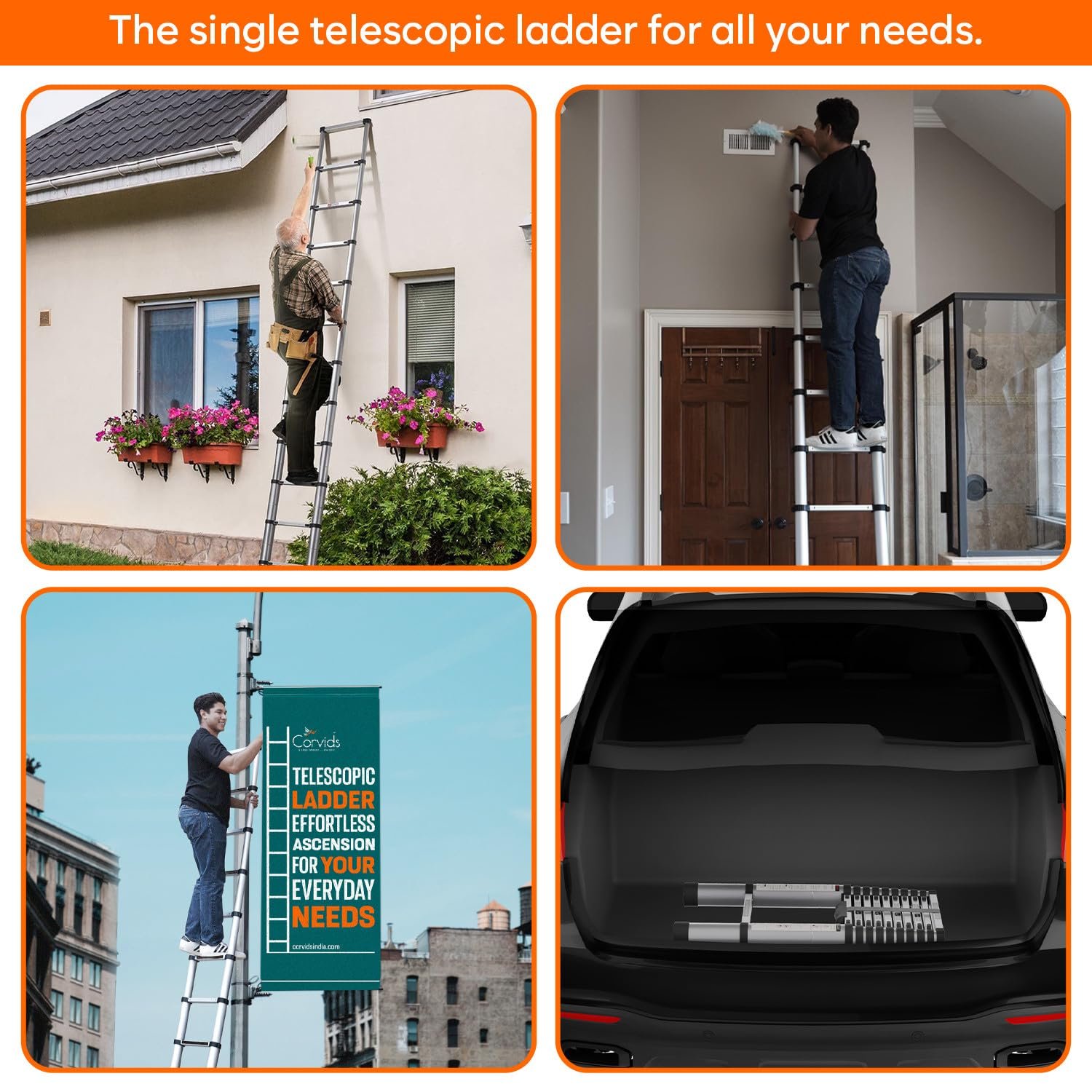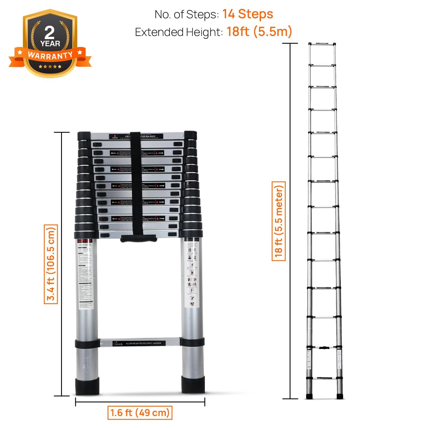 Corvids 5.5m (18. ft) Portable & Compact Aluminum Telescopic Ladder | 2-Year Warranty | EN131 Certified 14-Steps Foldable Multipurpose Step Ladder for Home & Outdoor use