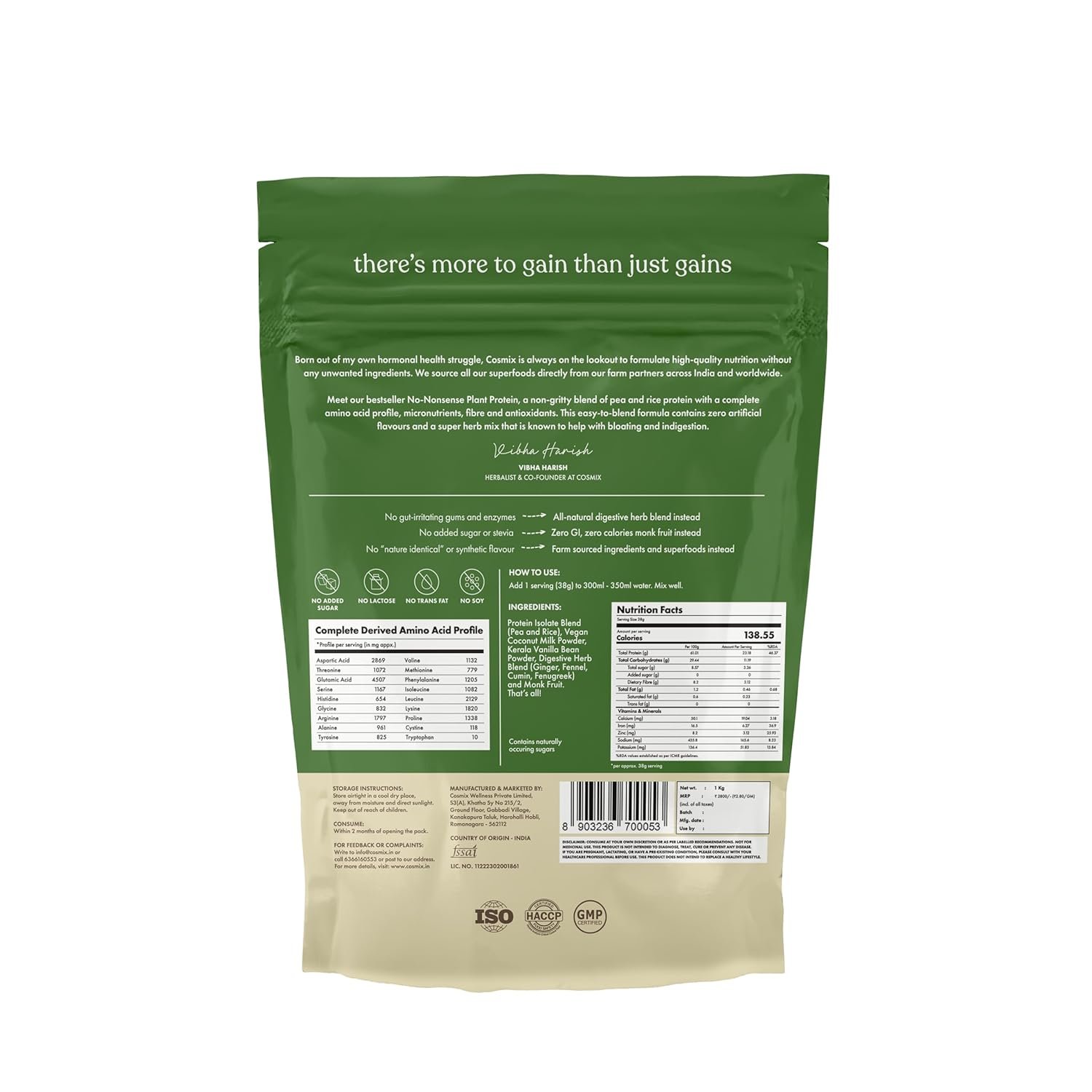 Cosmix No-Nonsense Plant Protein | 26 Protein/Serve, 1Kg Pouch | Kerala Vanilla Bean | Plant Based Protein, Pea & Rice Isolate | Clean, Easy to Digest | All Essential Amino Acids