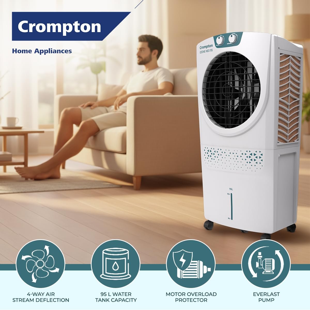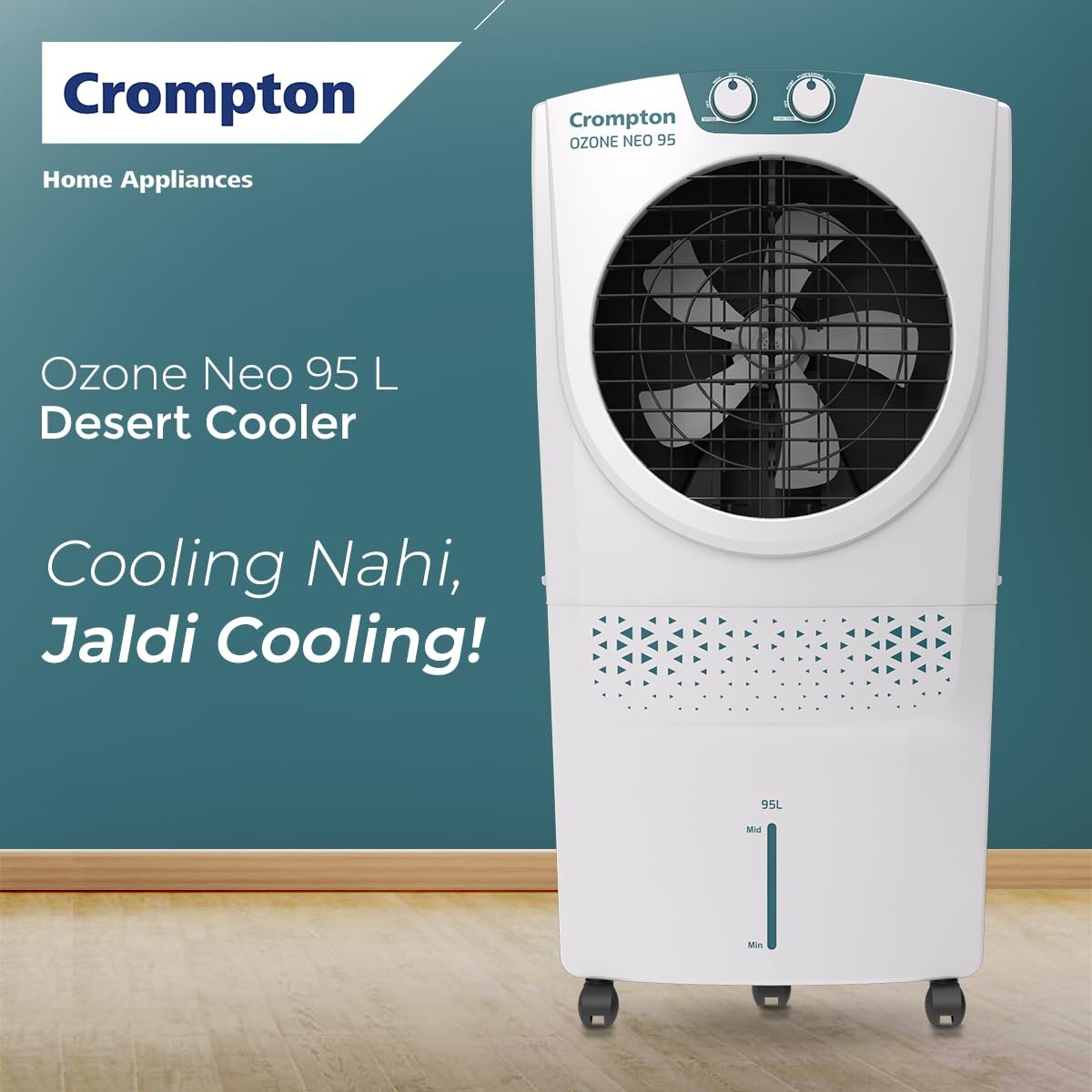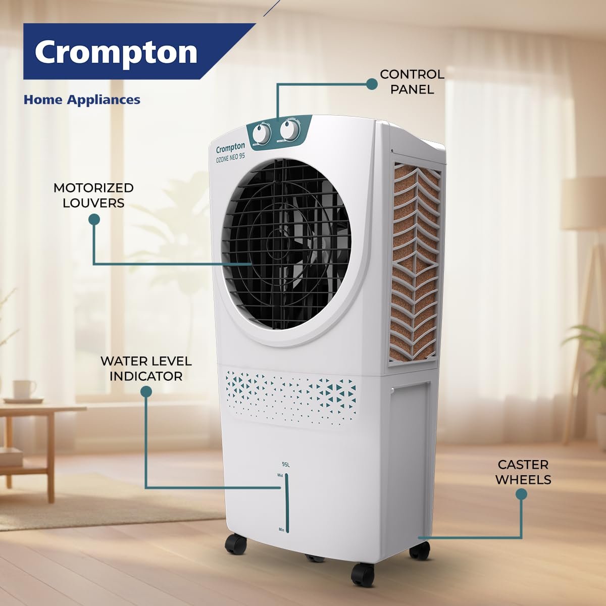 Crompton Ozone Neo Desert Air Cooler 95L| High density honeycomb Pad for Cooling Retention| Water Level indicator| 4 way Air deflection & Auto Swing | Everlast Pump
