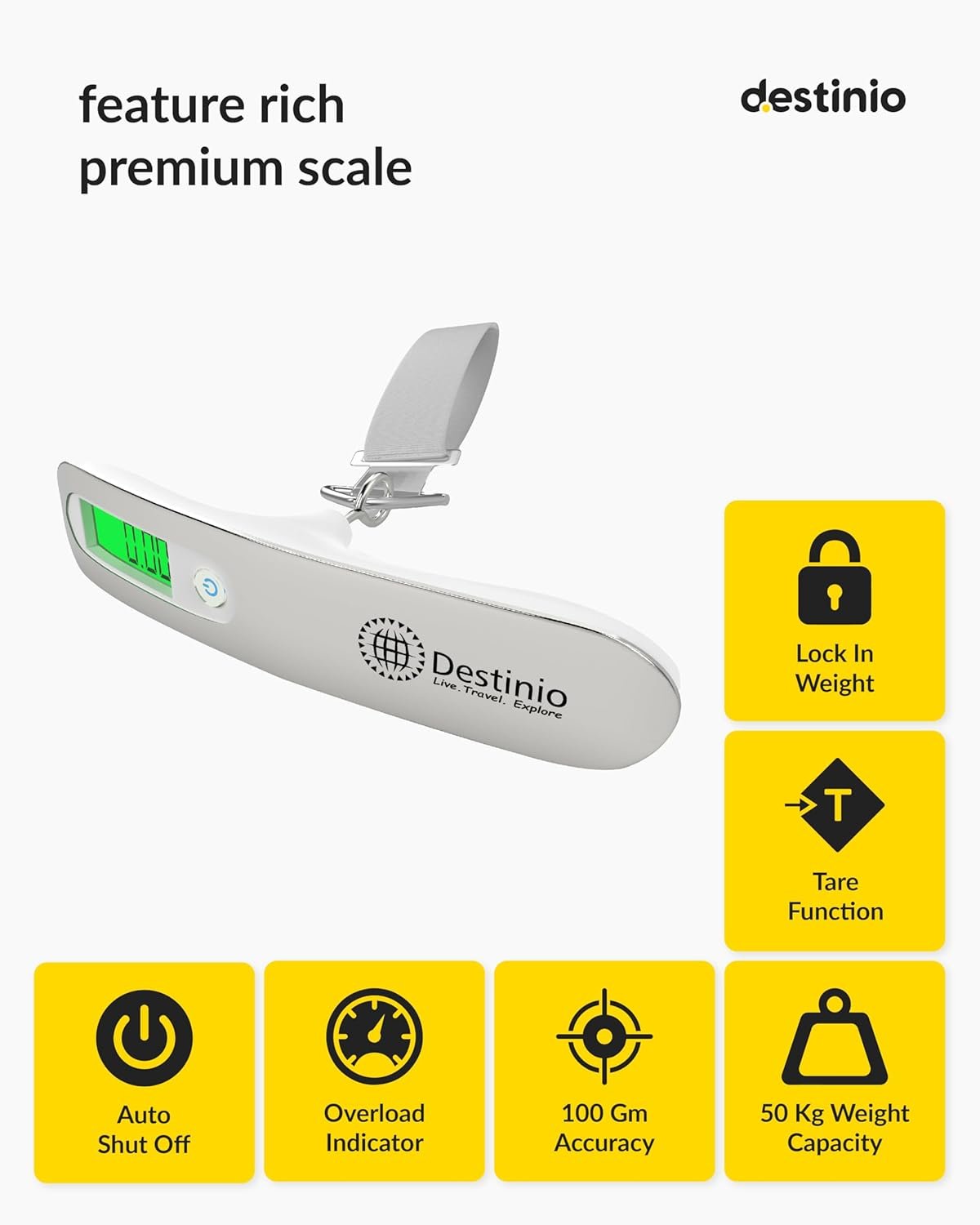 Destinio Digital Weight Machine for Luggage – 50kg Capacity, Portable Hanging Weighing Scale for Bags, Baggage, Travel, Shop, Home & Gas Cylinder – Suitcase Weighing Scale, Luggage Scale for Flights
