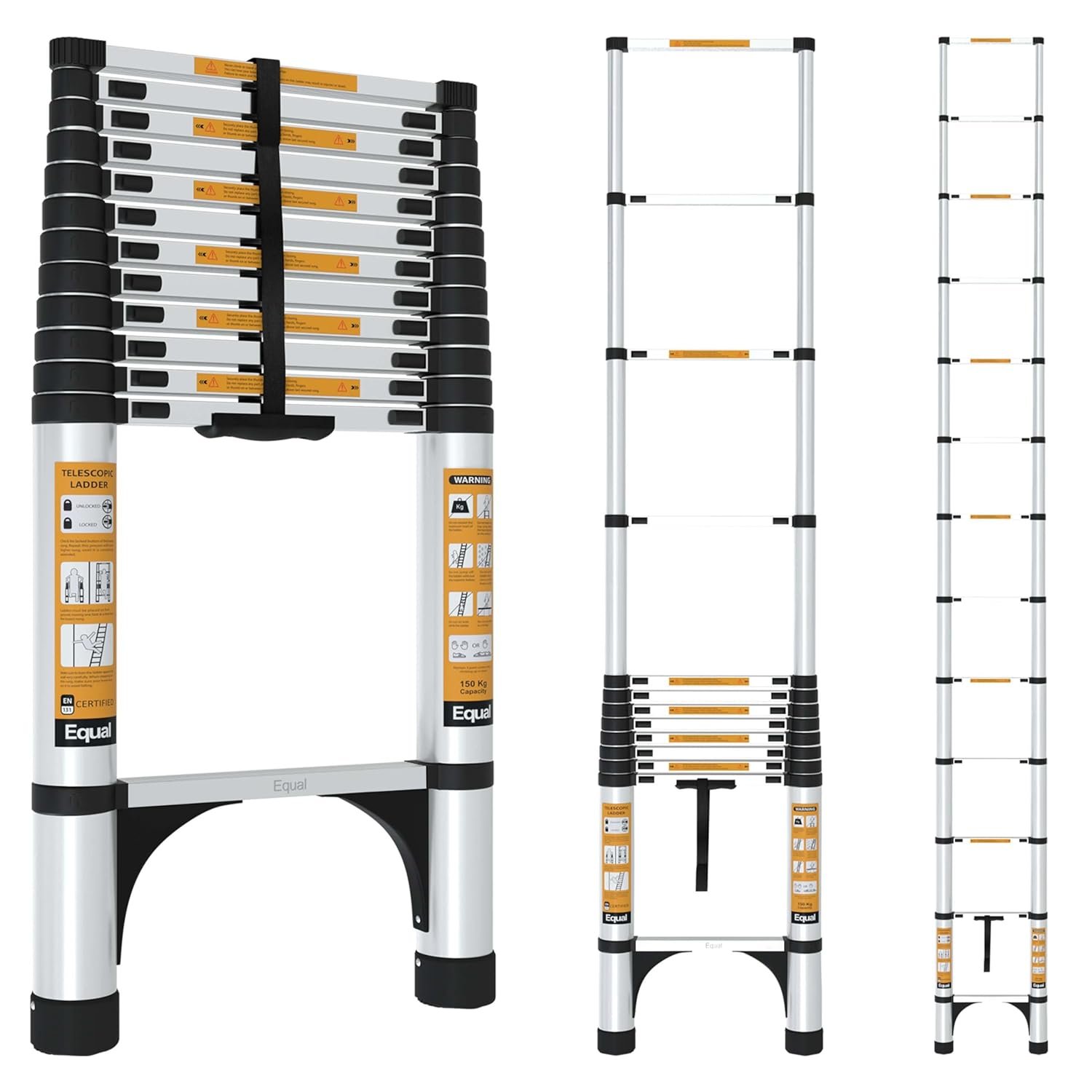 Equal 16.5 FT Aluminum Folding Telescopic Ladder with 2 Triangle Stabilizers | EN131 Certified with 2 Year Warranty | 150kg Max Capacity | Collapsible Ladder for Home or Outdoor Work (5m/13 Step)
