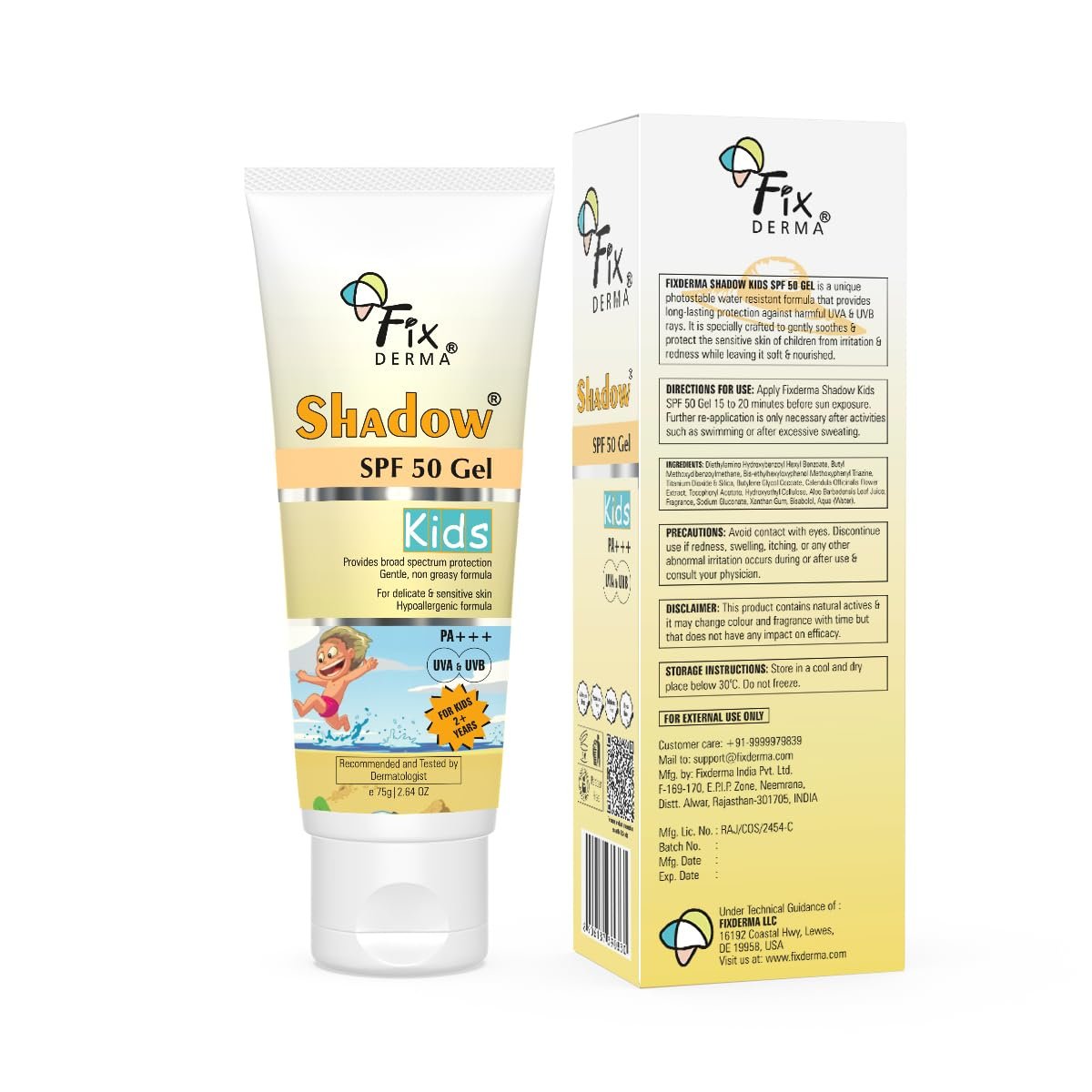 Fixderma Shadow Sunscreen SPF 50+ Gel for Kids PA+++ | Broad Spectrum Sunscreen for UVA & UVB Protection, Non-Greasy & Water Resistant – For Kids 2+ Years Age, 75gm