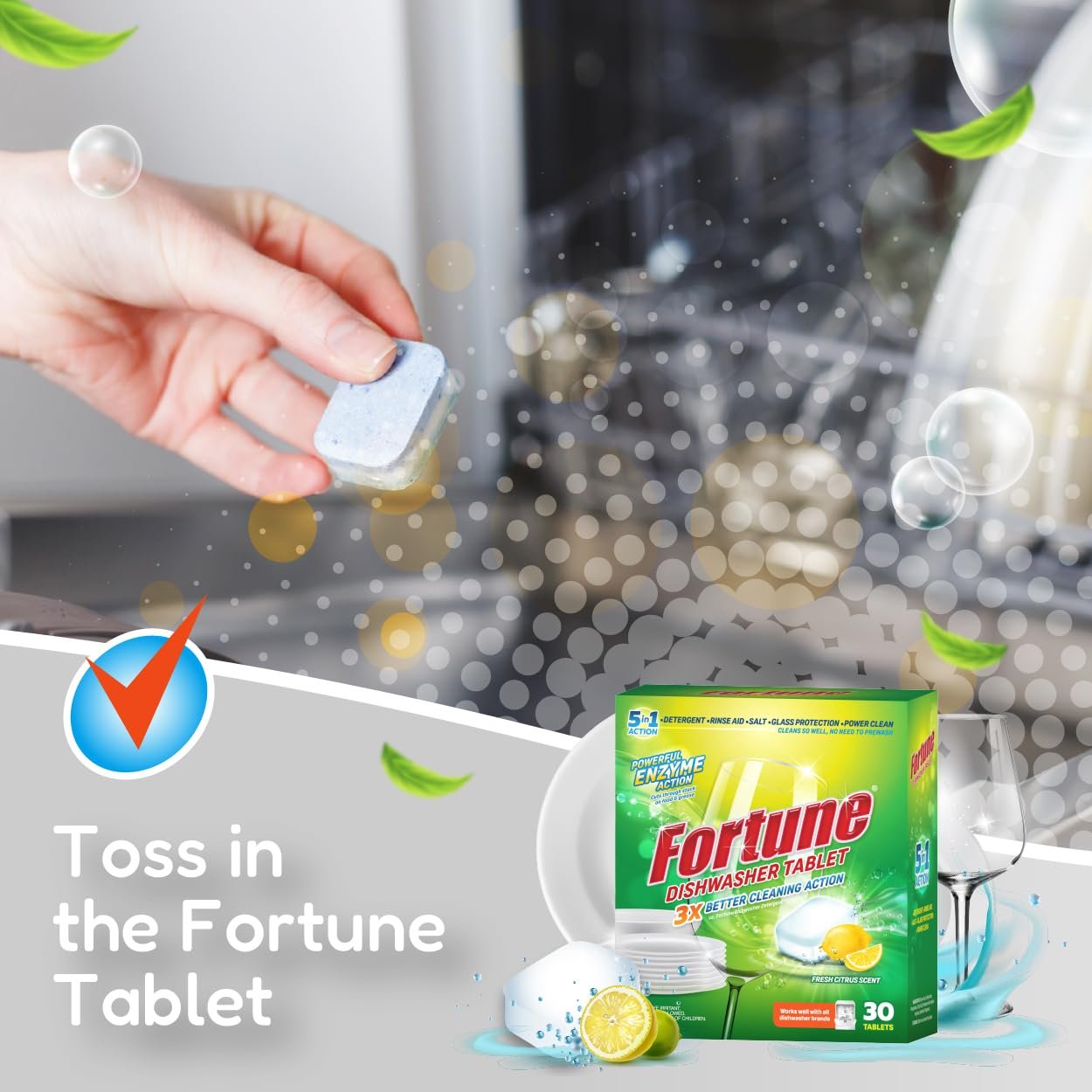 FORTUNE Dishwasher Tablets, 5 in 1 Action, Fresh Scent, 30 Count