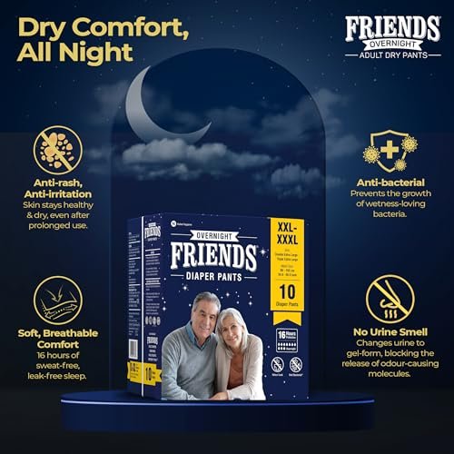Friends Overnight Adult Diapers Pant Style | 80 Count (XX- Large) | Waist 34-65 Inch; 86-165 cm with odour lock | Unisex | Leakproof | Elastic Waist and Anti-Bacterial Absorbent Core