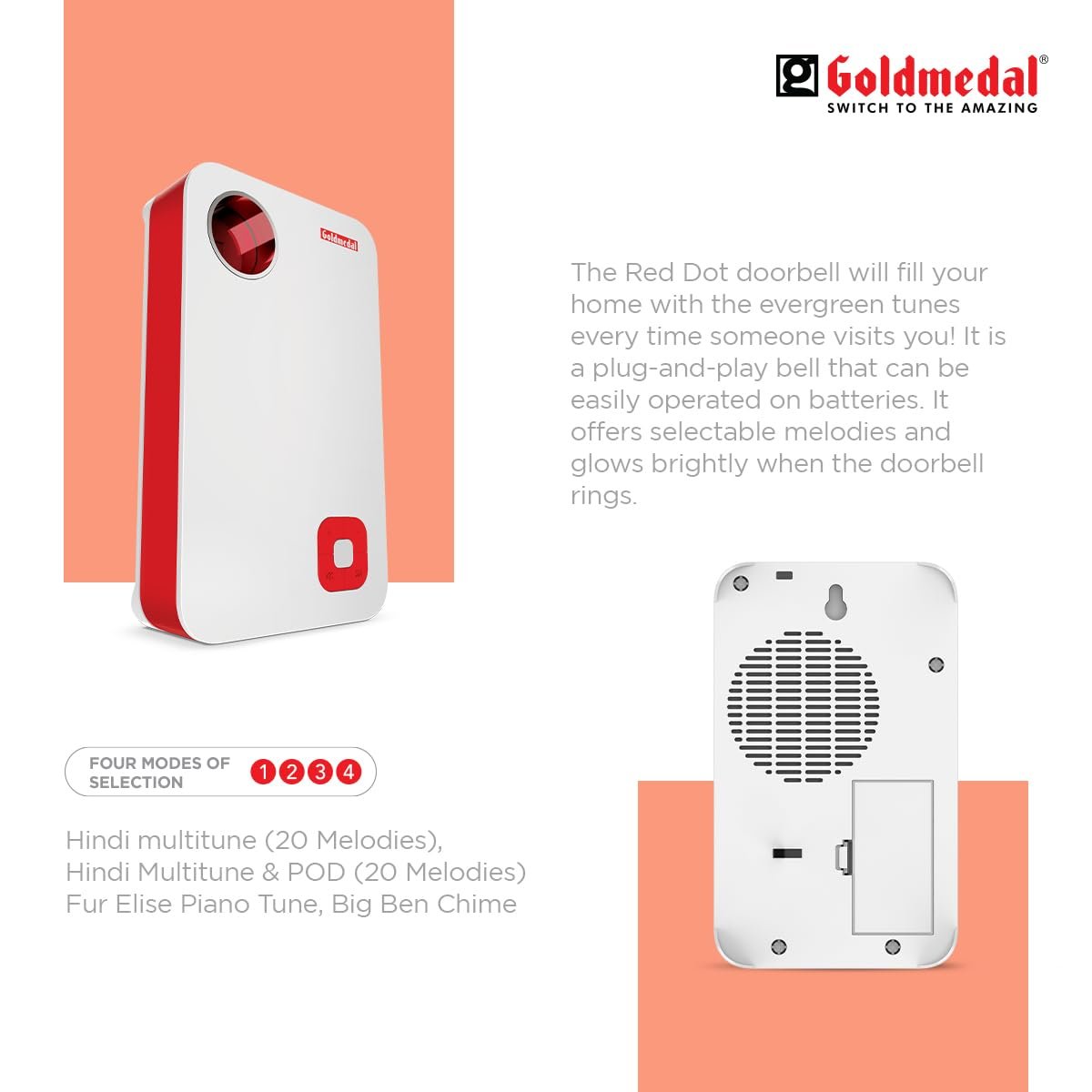Be the first to review “Goldmedal Red Dot Polyphonic Door Bell For Home | Calling Bell For Office,School | Wired Electric Door Bell | LED Flash Light | – White & Red”