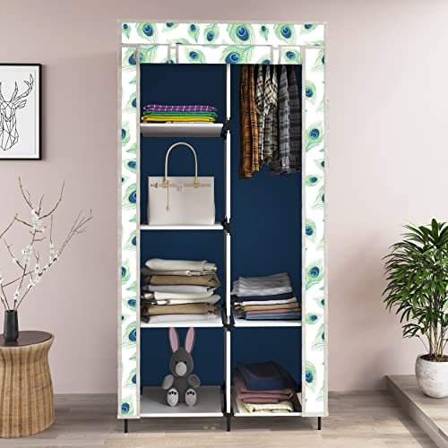 GTC® Printed Collapsible Wardrobe Clothes Almira, 1 Hanging Space, 6 Shelves, 1 Side Pocket (Non-Woven Fabric 100GSM, Metal Rod, 76x38x145cm) (2001-3 Peacock Blue)