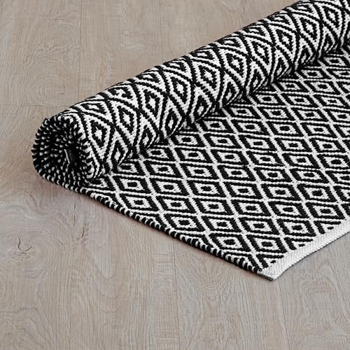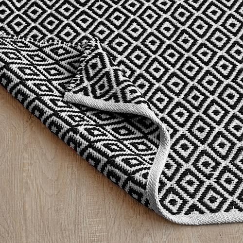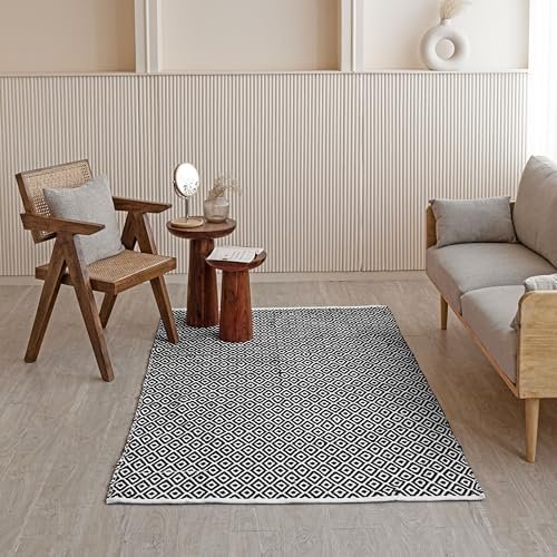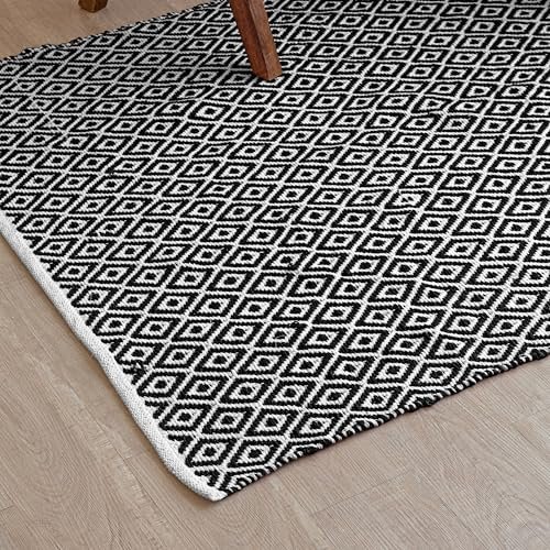 HOMEMONDE Diamond Pit Loom Area Rectangular Rugs Living Room Cotton Carpet For Bedroom Home Decorate Floor Rug Kids Playing Mat (Black & White, 3 X 5 Feet)