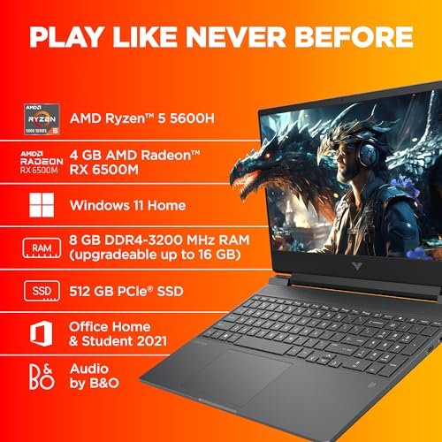 HP Victus Gaming Laptop, AMD Ryzen 5 5600H, 4GB AMD Radeon RX 6500M graphics, 15.6-inch (39.6 cm), FHD, IPS, 144Hz, 8GB DDR4, 512GB SSD, Backlit KB, B&O, Dual speakers (MSO, Silver, 2.37 kg), fb0777AX
