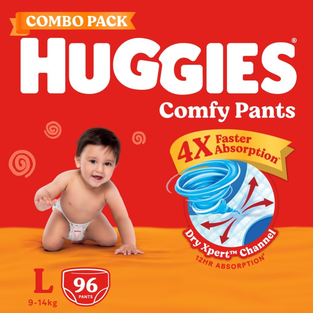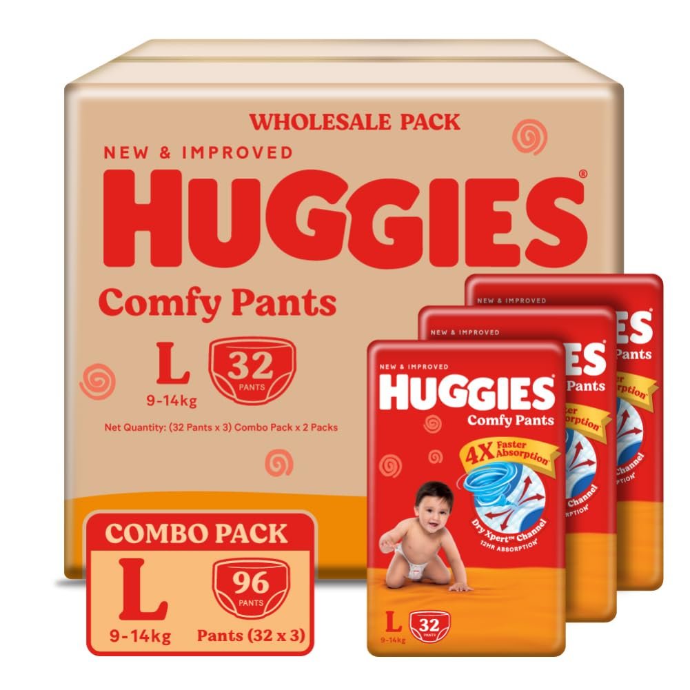 Huggies Comfy Pants Baby Diaper, Large (L) Size (9-14 Kgs), Pack of 96 (32 Count, Pack of 3)