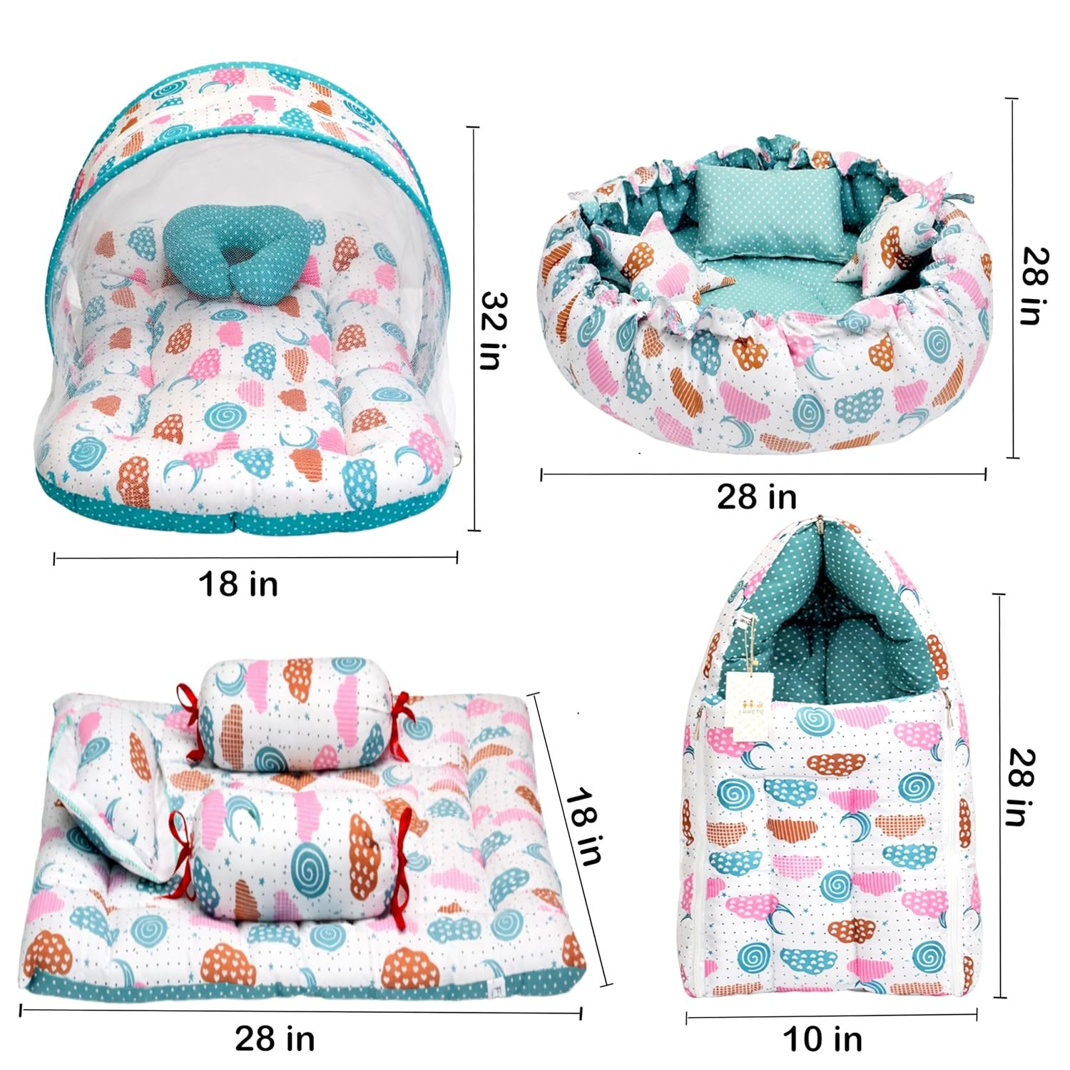 Infantbond Baby Mattress with net | Baby Carry Bag | 4 Pcs Bedding Set | Baby Nest (0-6 Months) (Pista Green Sprial) (Full Set Nest)