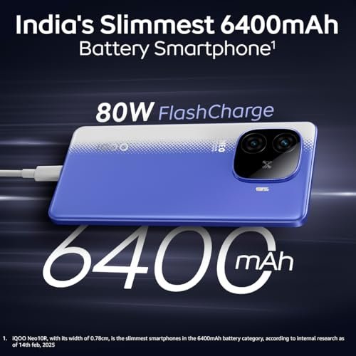 iQOO Neo 10R 5G (Raging Blue, 8GB RAM, 128GB Storage) | Snapdragon 8s Gen 3 Processor | India’s Slimmest 6400mAh Battery Smartphone | Segment’s Most Stable 90FPS for 5 Hours