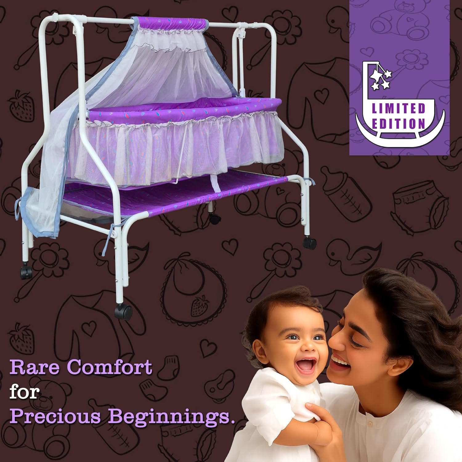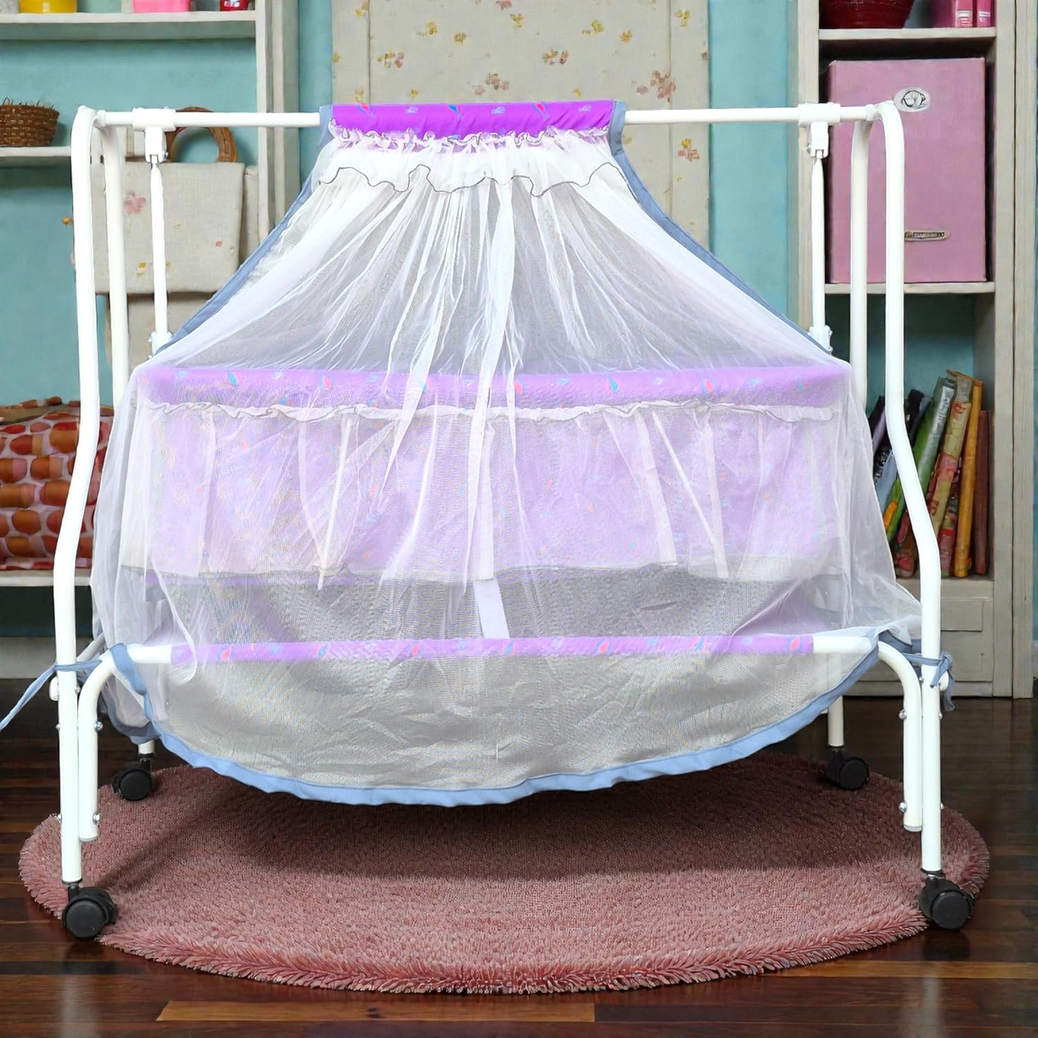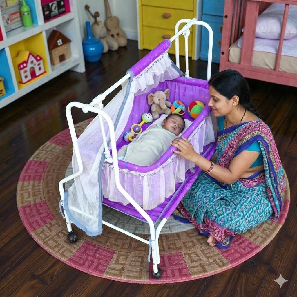 Kiddery Hestia | Cradle for Baby | New Improved Mattress Design | Mosquito Protection Net | Smooth Swing | All Wheel Lock | Palna | Jhula | Uyyala | 0-10 Months | Purple