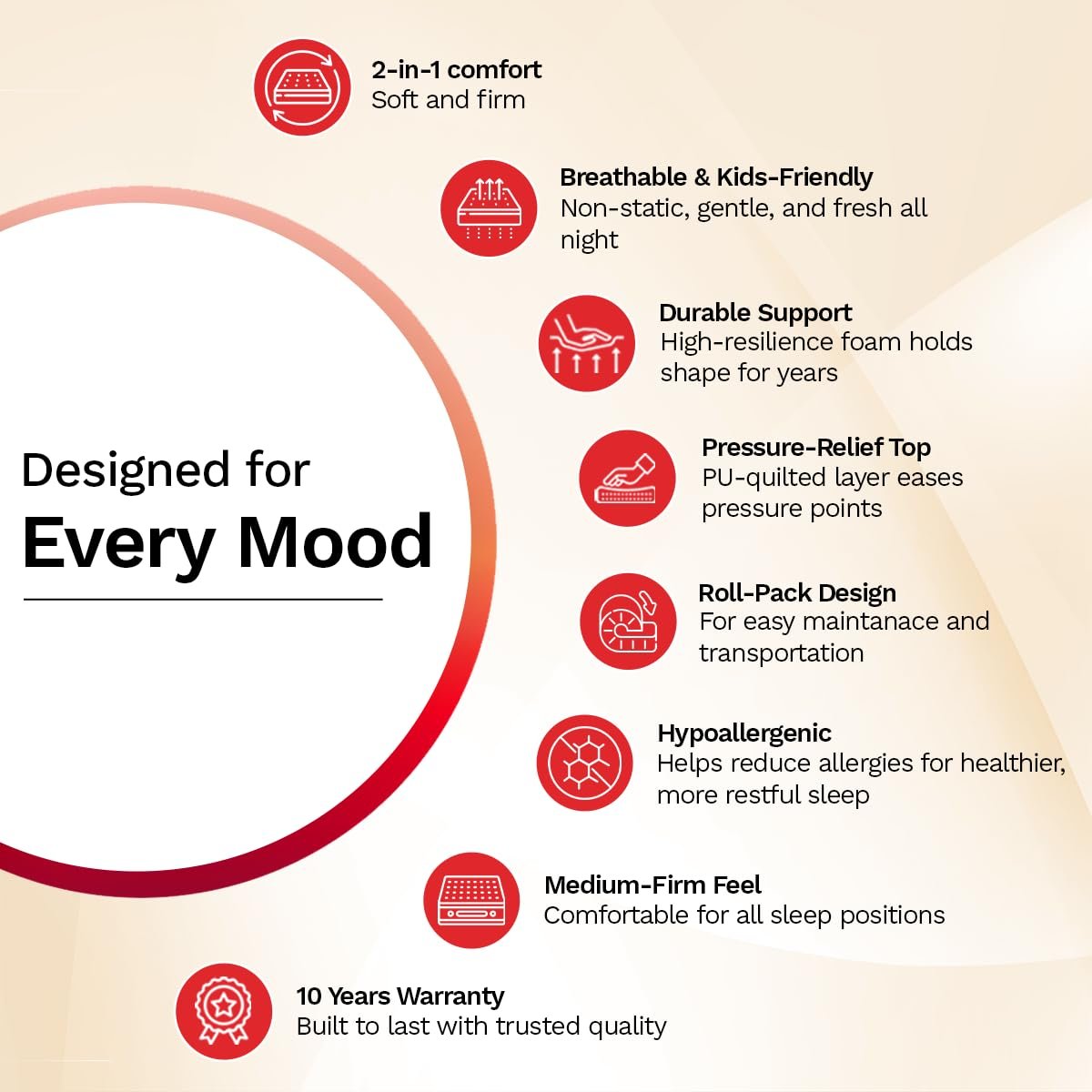 Kurlon Dual 4 Inch Mattress | Double Bed Mattress | Hypoallergenic & Comfortable | Dual Comfort | Reversible | Soft & Firm Support | High Resilience | Kids Friendly | 72x48x4 | 10 Years Warranty