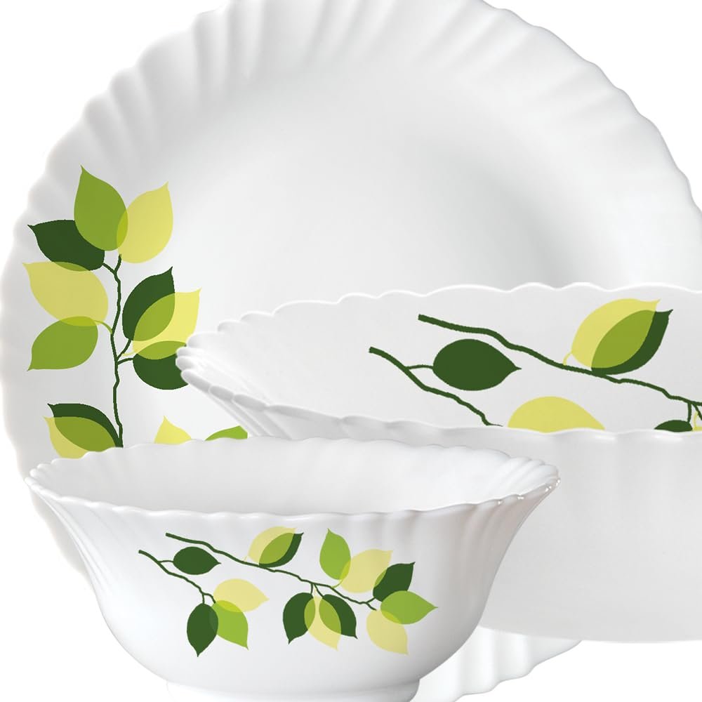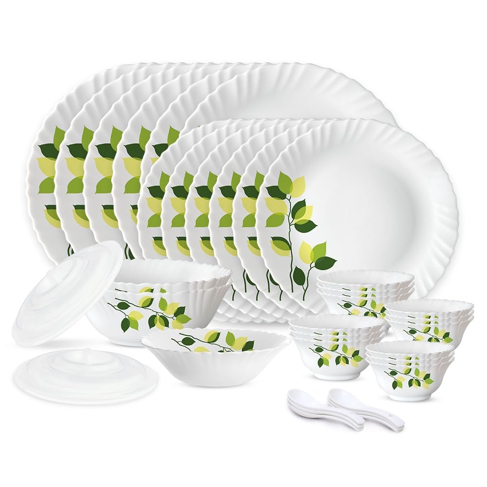 Larah by Borosil Green Leaves Silk Series Opalware Dinner Set | 35 Pieces for Family of 6 | Microwave & Dishwasher Safe | Bone-Ash Free | Crockery Set for Dining & Gifting | Plates & Bowls | White