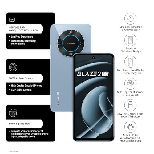 Lava Blaze 2 5G (Glass Blue, 6GB RAM, 128GB Storage)| Stunning Ring Light| 50 MP AI Camera |5000 mAh Battery| Upto 12 GB Expandable RAM