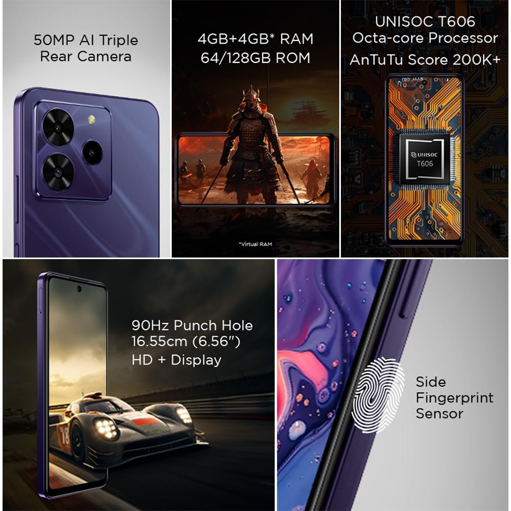 Lava O3 Pro (Glossy Purple, 4 GB RAM, 64 GB Storage)| Bigger 6.56″ HD+ Display | 50 MP AI Triple Rear Camera | 8 MP Front Camera| 5000 mAh Battery | 10W Charging | Charger in Box