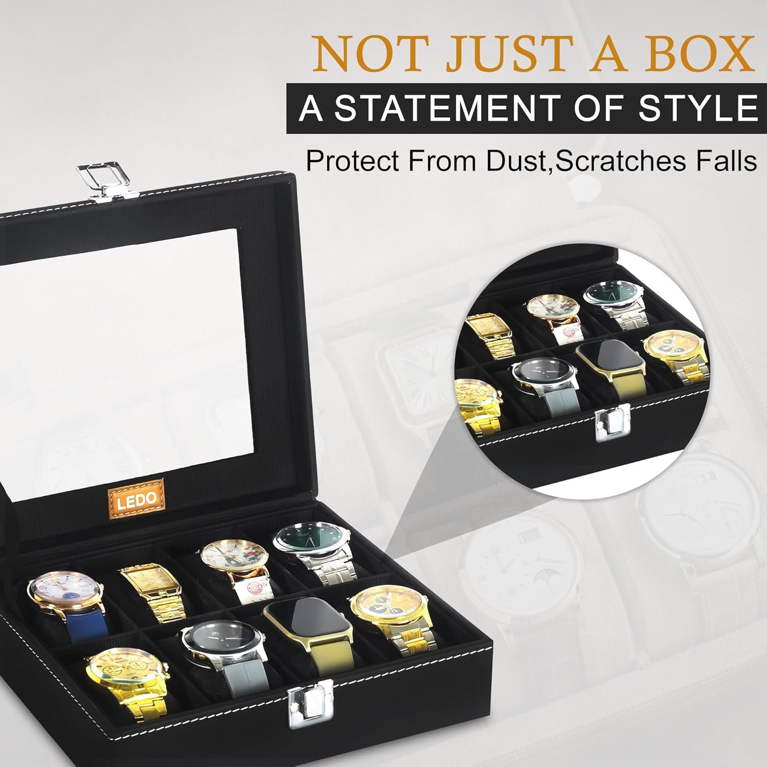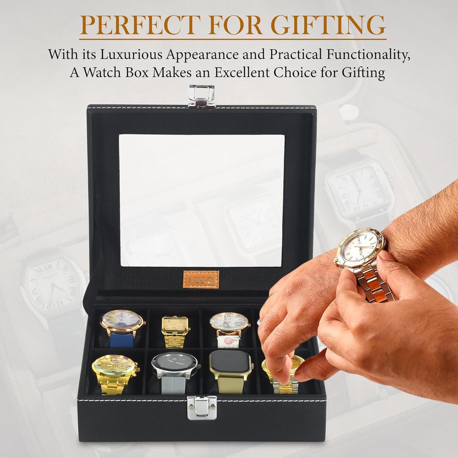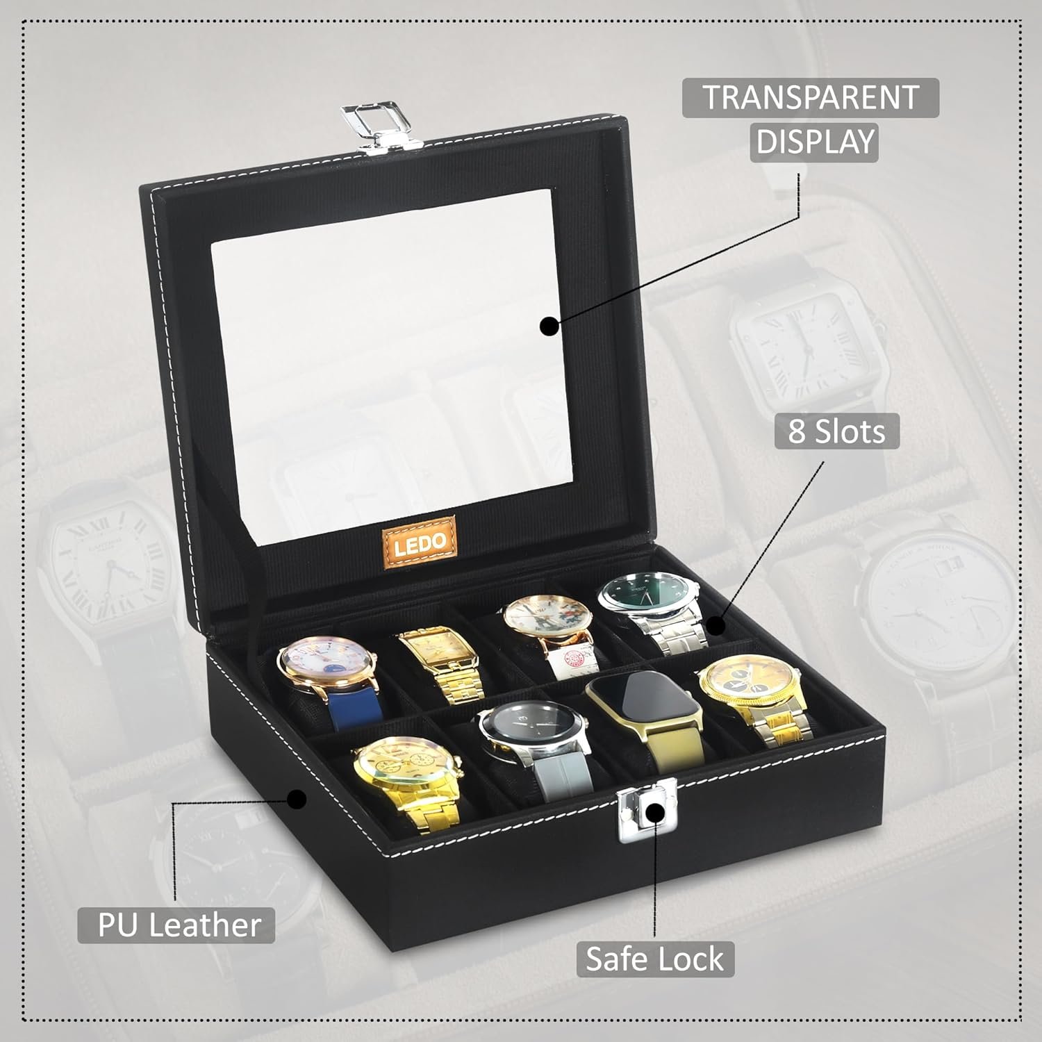Be the first to review “LEDO Men’s and Women’s Watch Box Holder Organizer Case In 8 Slots of watches In PU Leather with Black & Black”