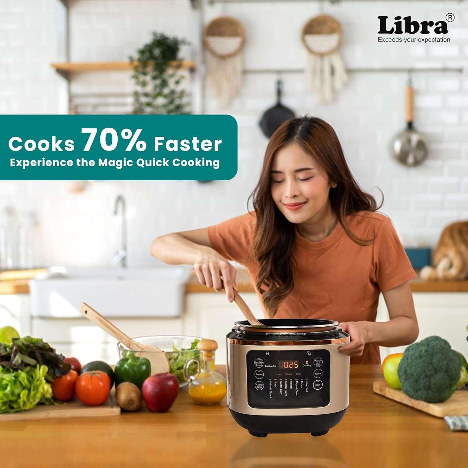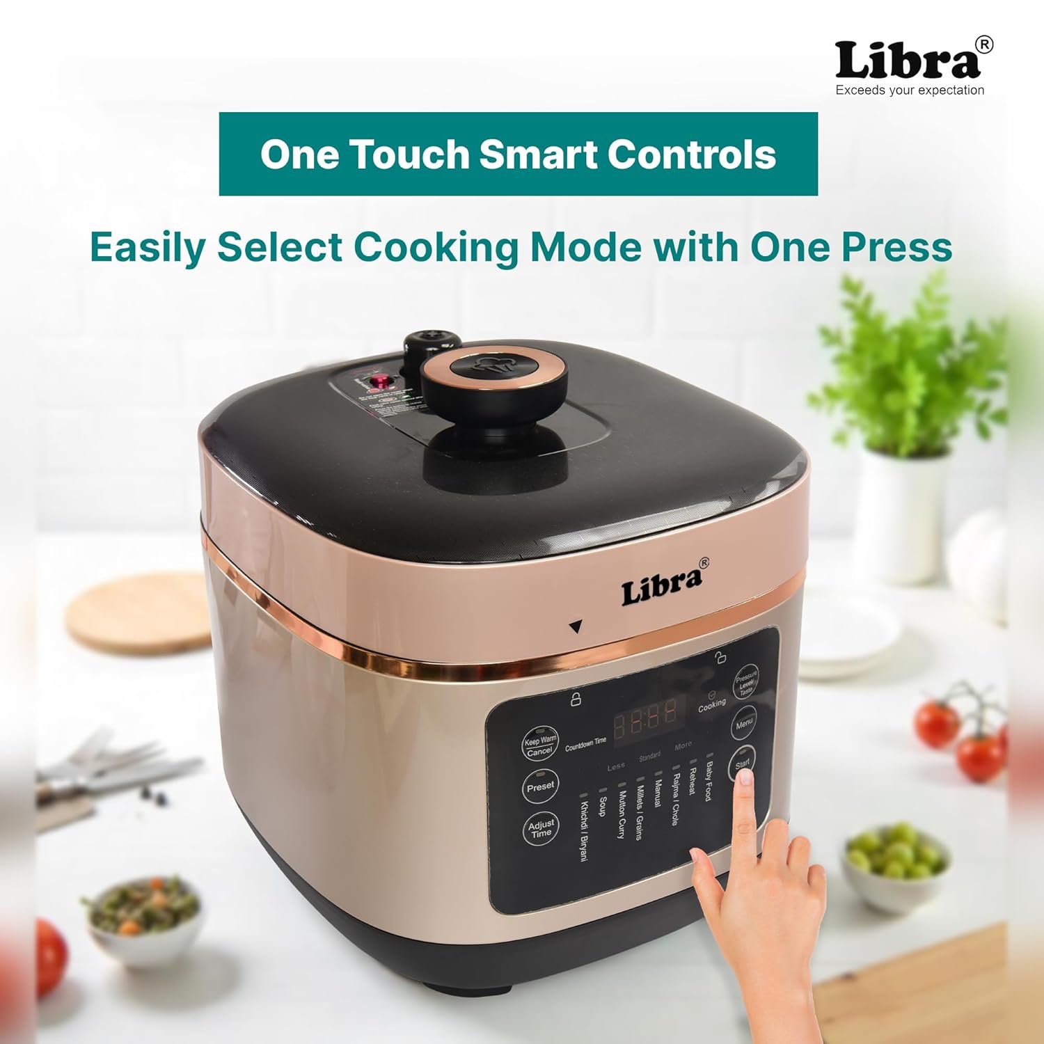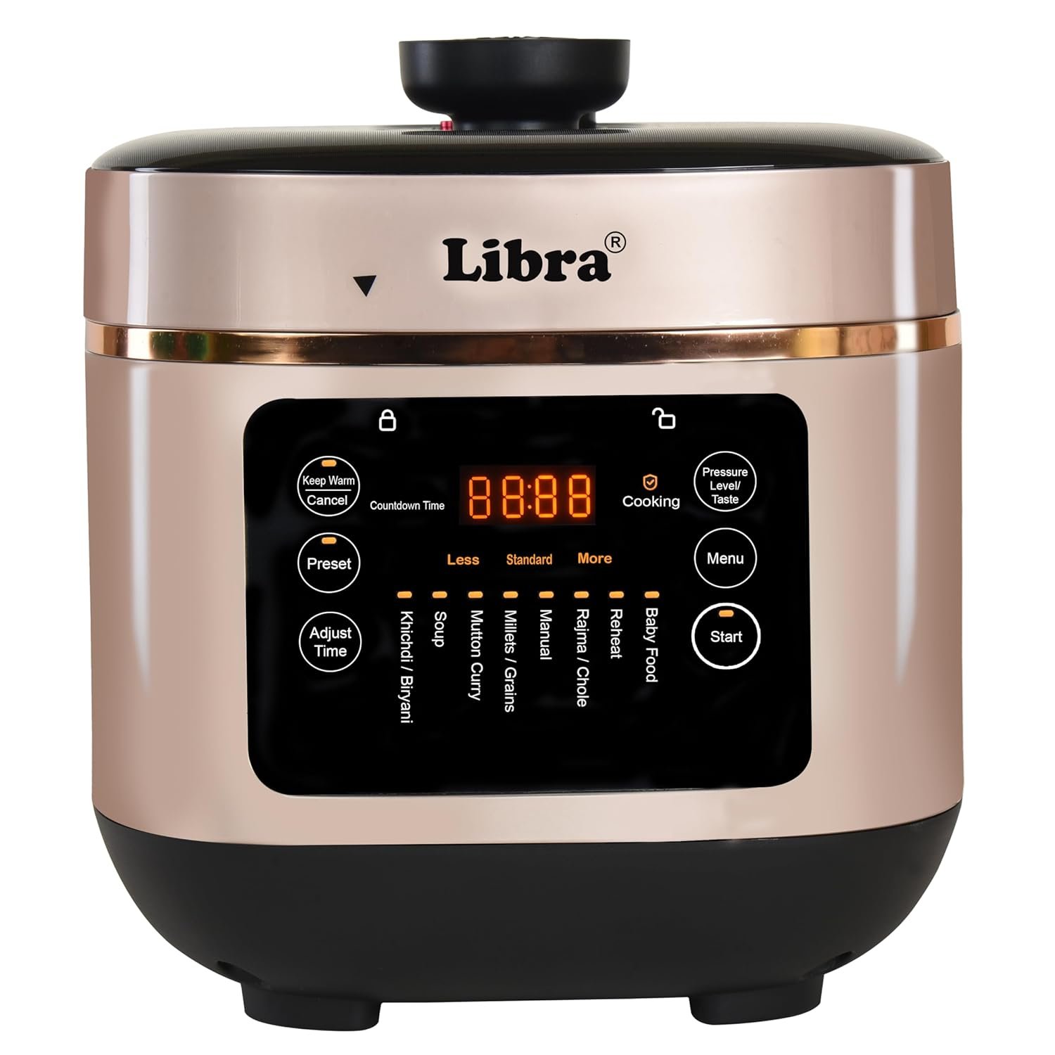 Libra 6 Litre Electric Cooker | Electric Pressure Cooker with Advanced Float Valve Safety | One-Touch Multi Cooking | Indian Preset Menus and Rice Cooker (Rose Gold)