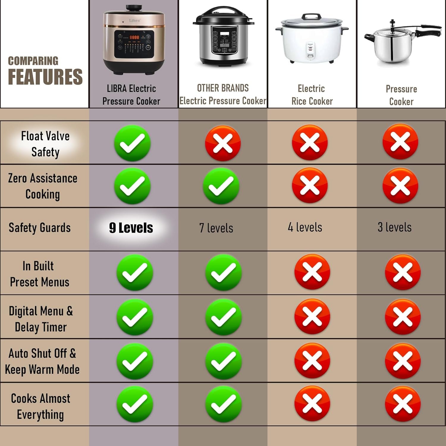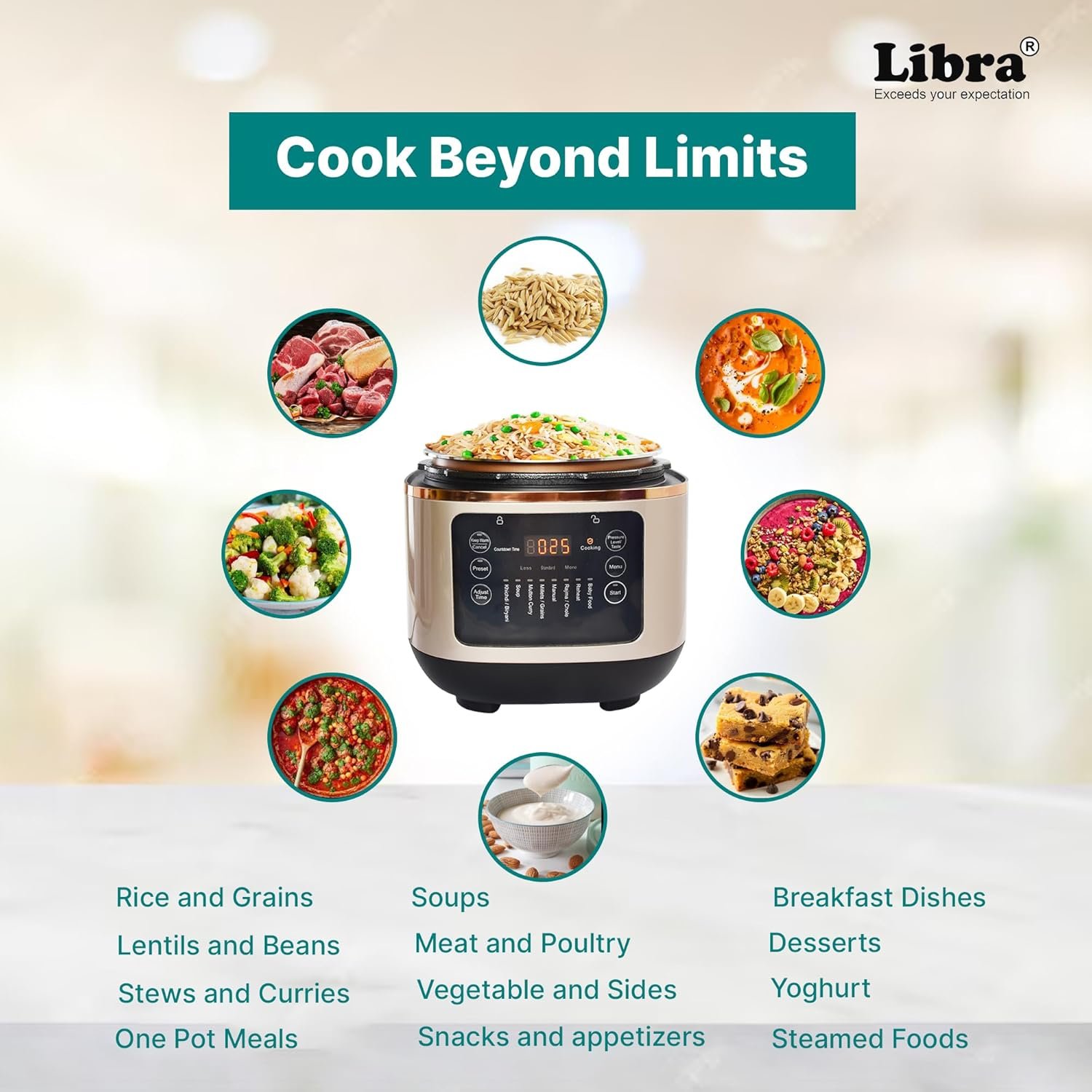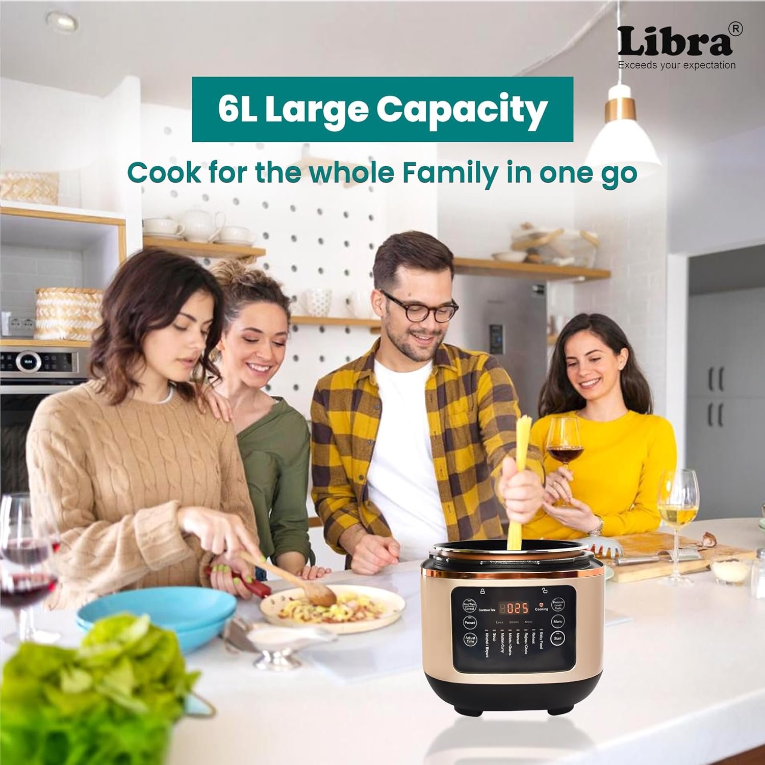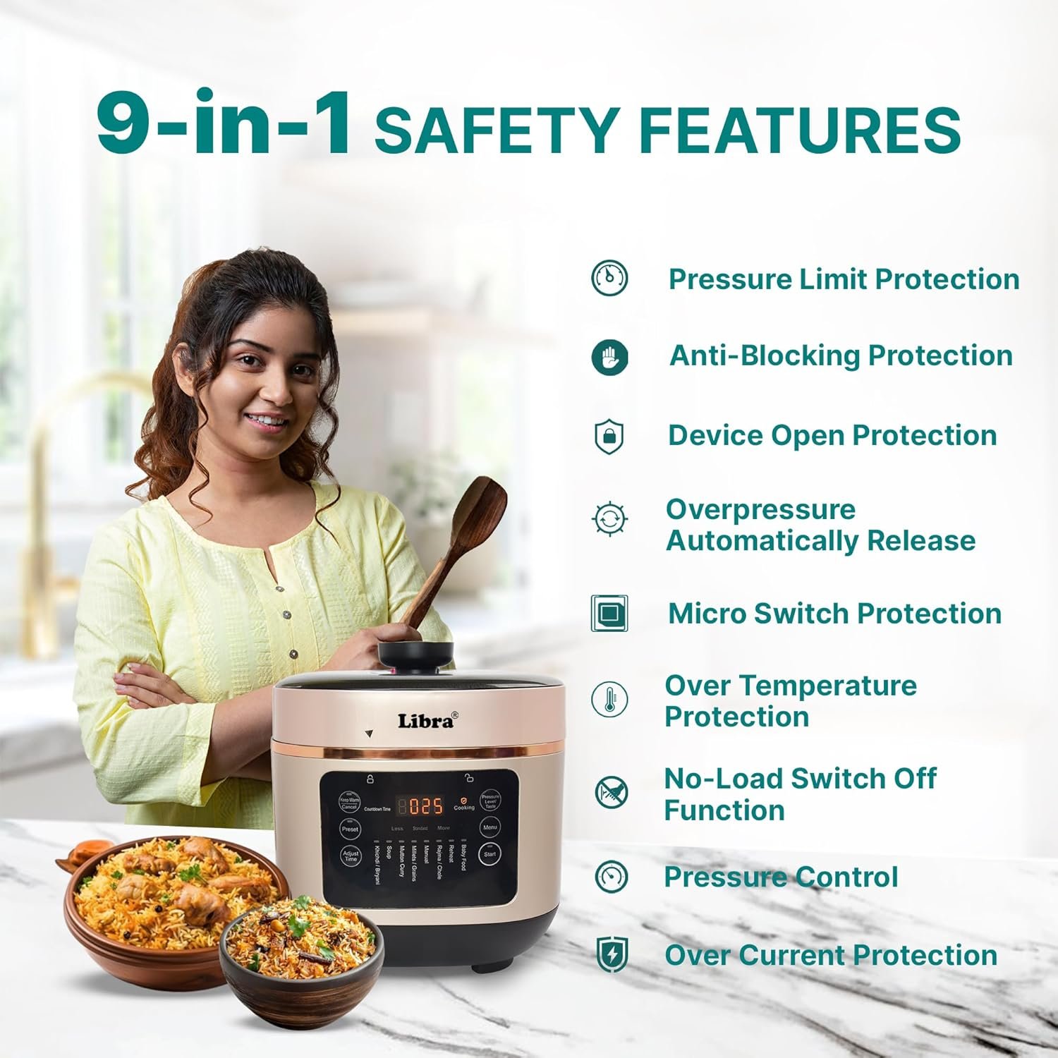 Libra 6 Litre Electric Cooker | Electric Pressure Cooker with Advanced Float Valve Safety | One-Touch Multi Cooking | Indian Preset Menus and Rice Cooker (Rose Gold)