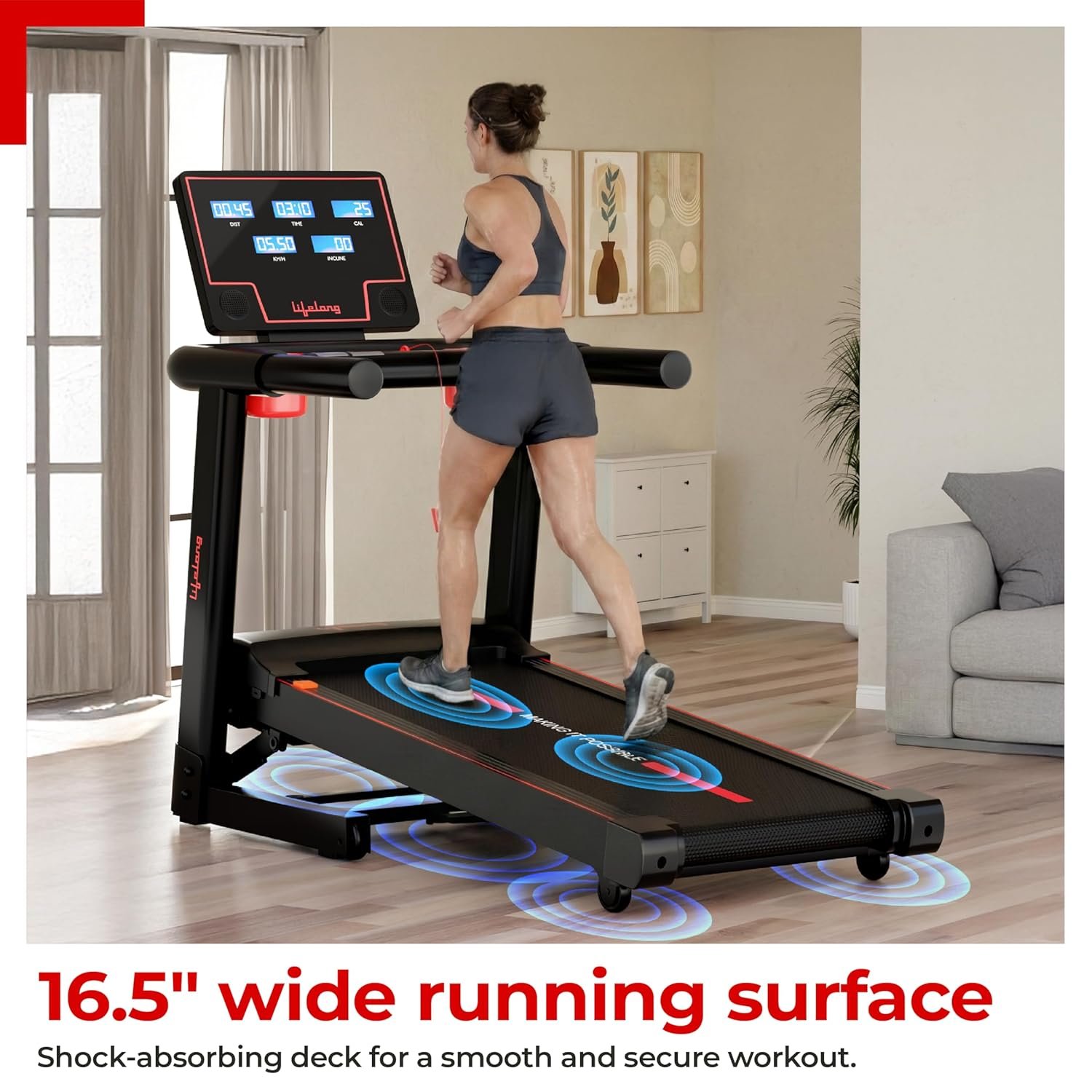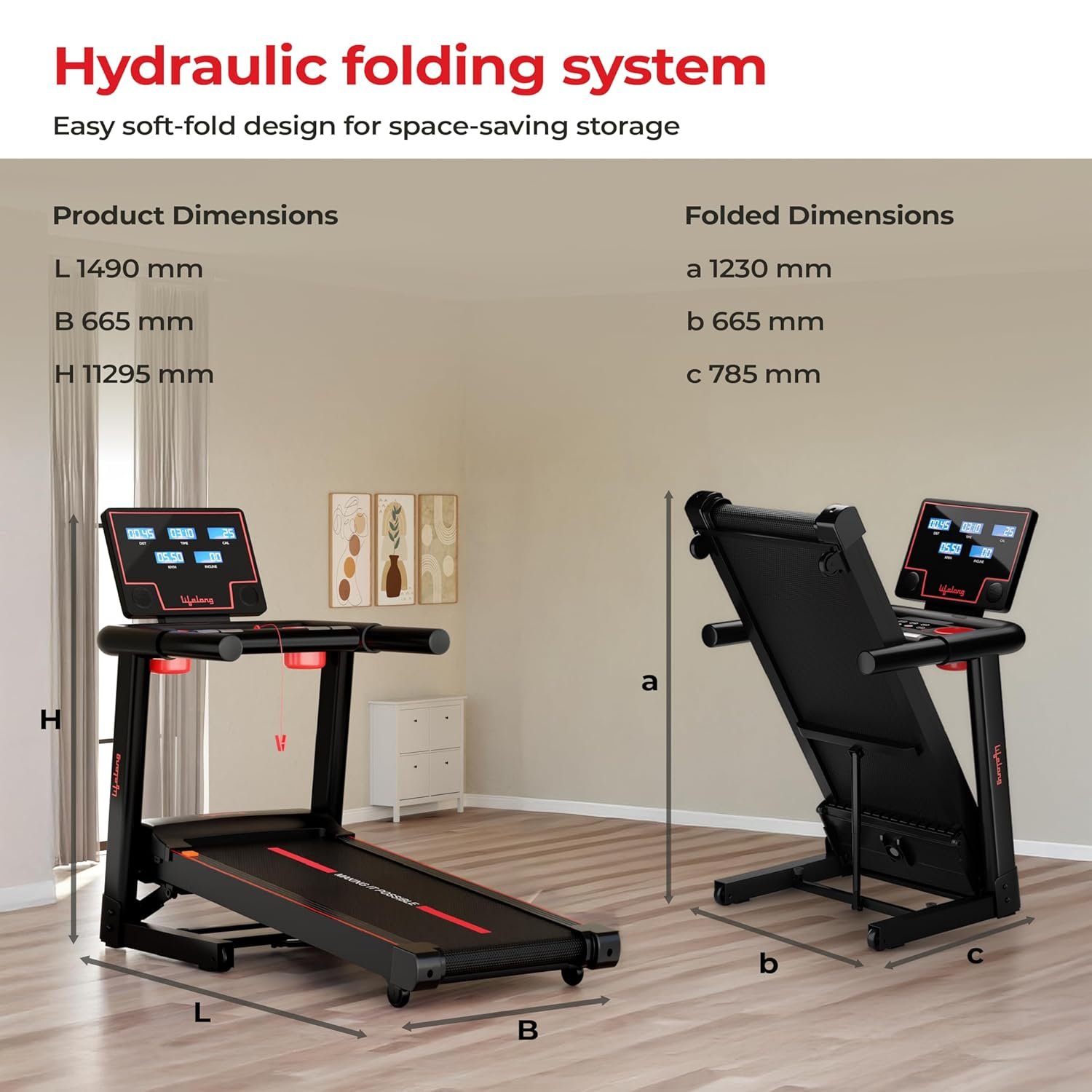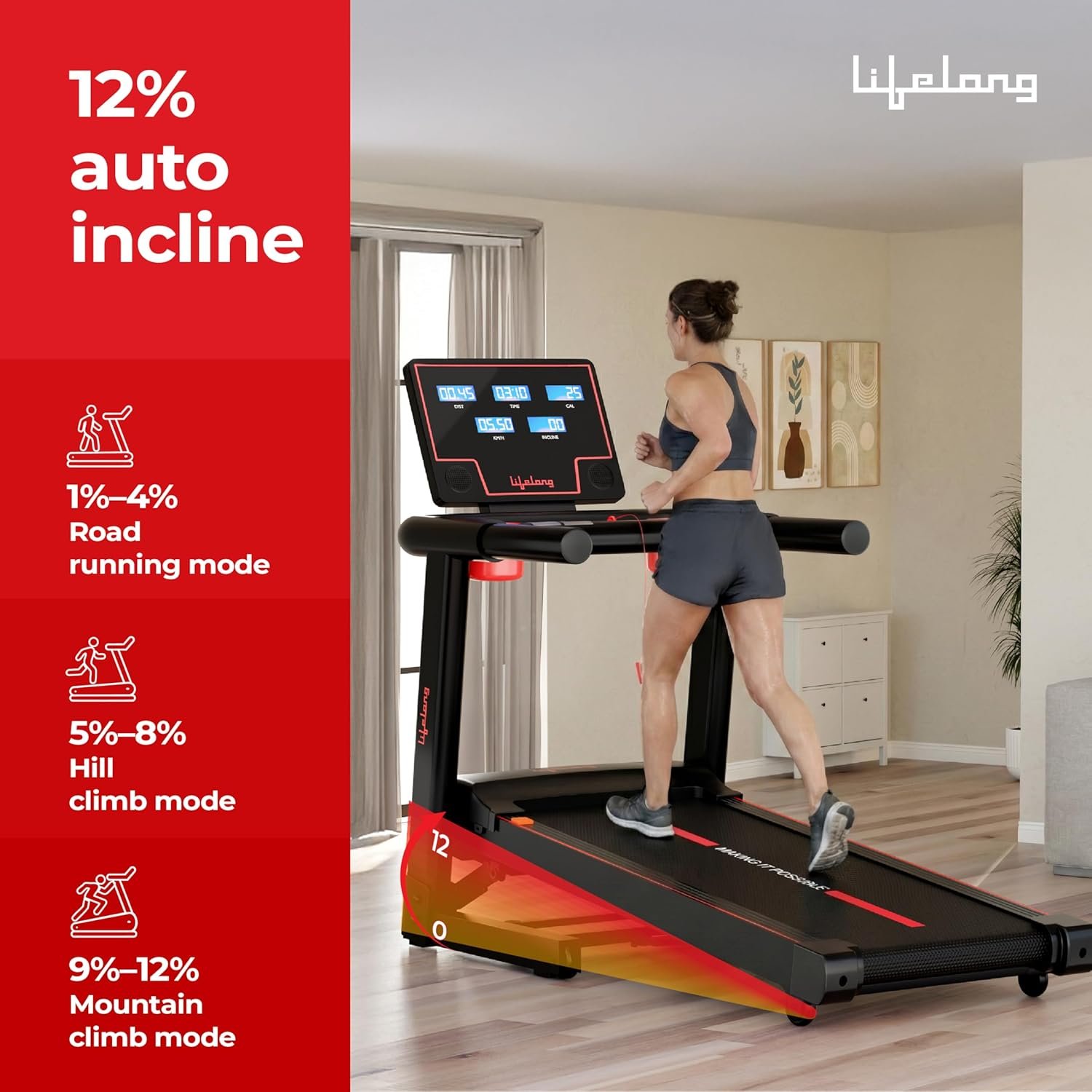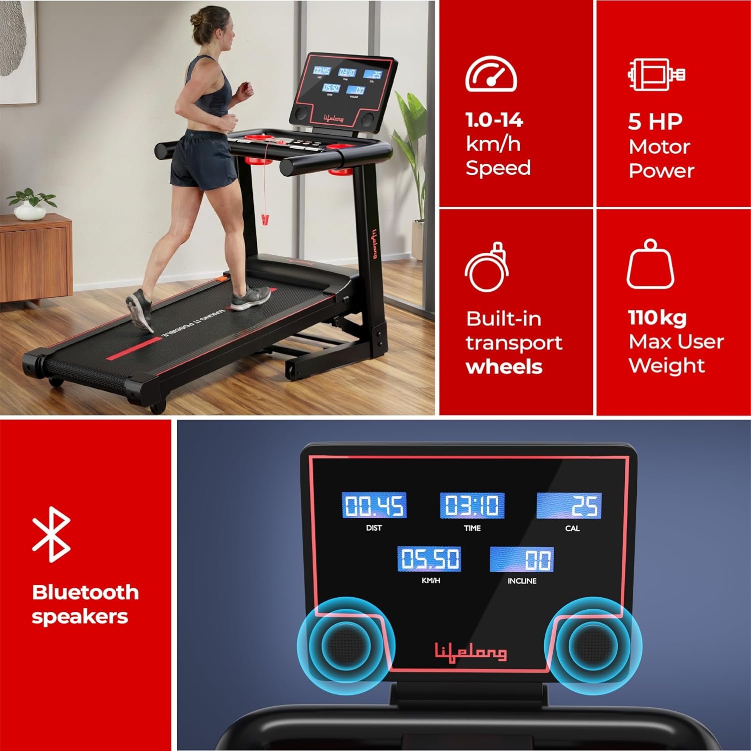 Lifelong 5HP Foldable Treadmill for Home | Home Workout Equipment | LED Display | 12% Auto Incline | 14 km/h Speed | 12 Preset Programs | Hydraulic Fold | Bluetooth & FitShow App | 110kg Max Weight