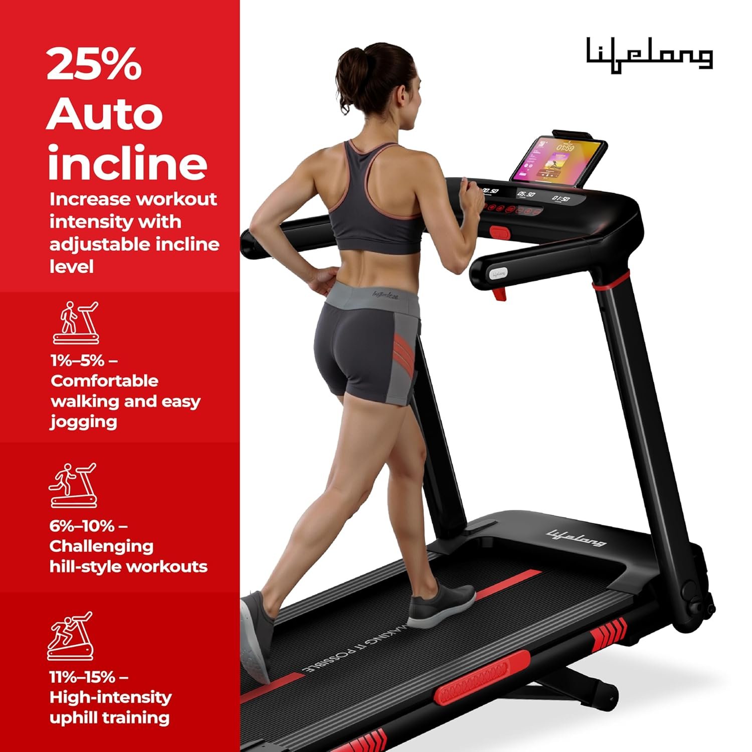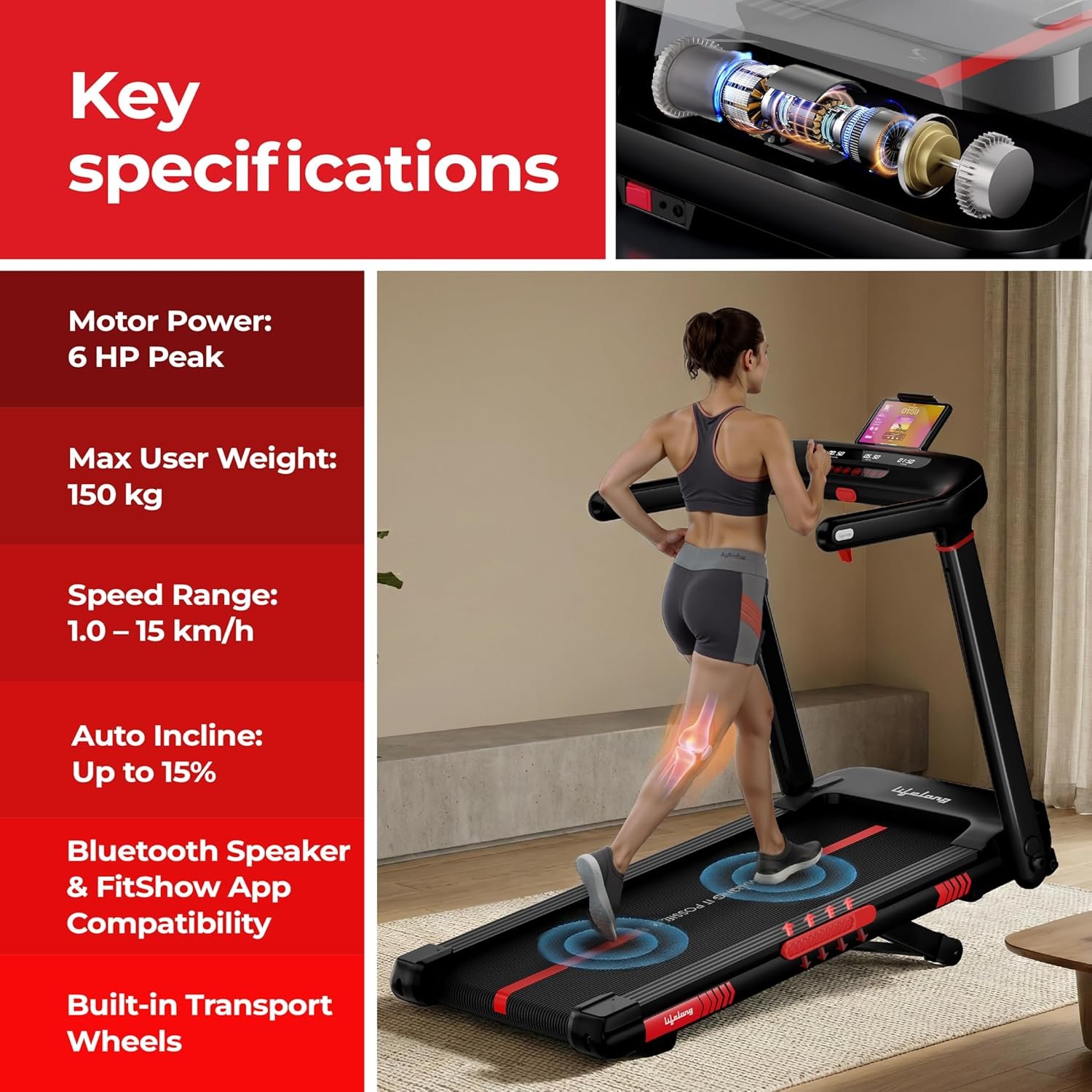 Lifelong 6HP Motorized Treadmill| 25 Levels Auto Incline | LED Display| Foldable | Max Speed 15 km/h | 150 kg Capacity | Brushless Motor Treadmill for Home Workouts | Bluetooth Speaker & FitShow App