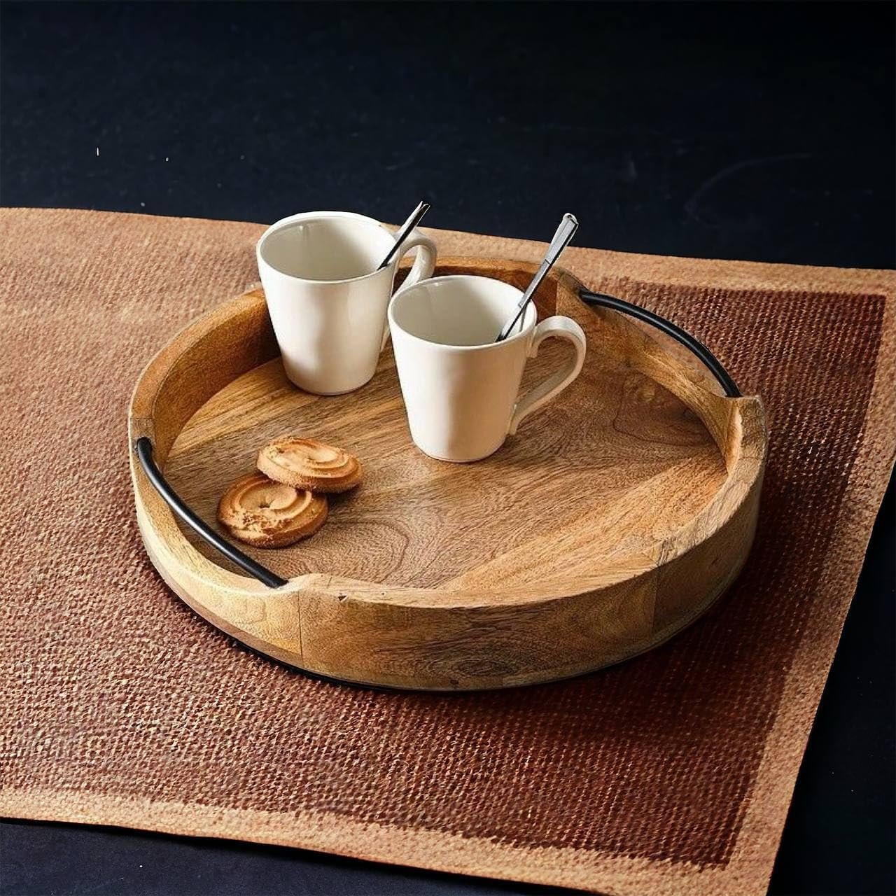Be the first to review “Medium Rustic Round Wooden Serving Tray 10x10x2 Inches – Handcrafted Mango Wood with Iron Handles – Decorative Kitchen & Dining Table Tray – Brown”