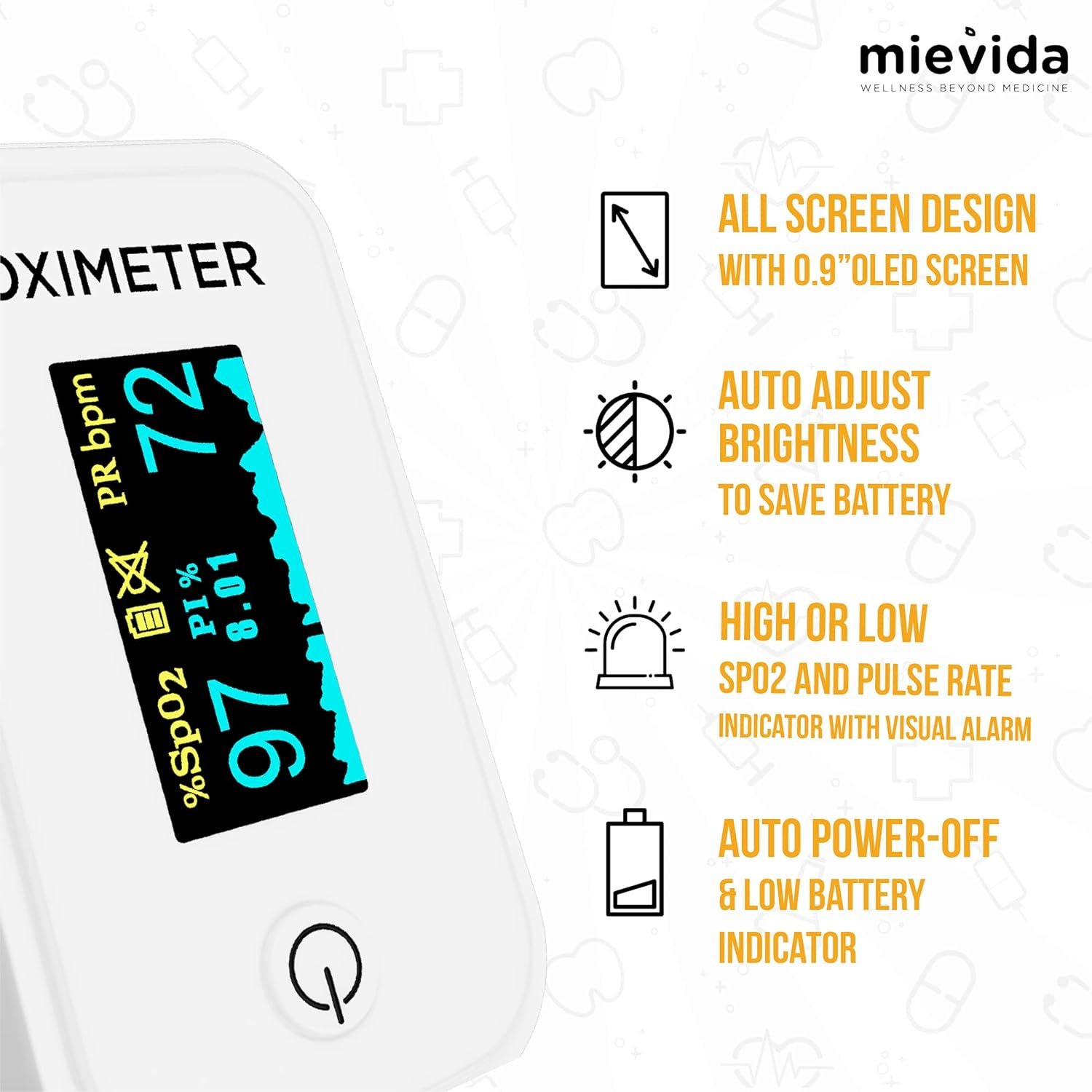 Be the first to review “Mievida Finger Tip Pulse Oximeter – FDA & CE Approved, OLED Display, Spo2, Pulse Rate Meter, Visual Alarm, Auto Power Off, Multicolor”