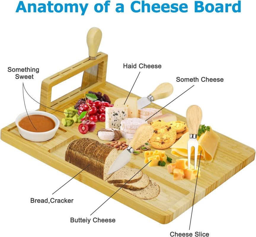 MosQuick®Bamboo CheesePlatter Board and Knife Set,Wood Charcuterie Board Set,A Perfect Serving Platter for Meat,Cheese,Crackers& Wine All Natural Bamboo with 4 Stainless Steel Cheese Knives and Server