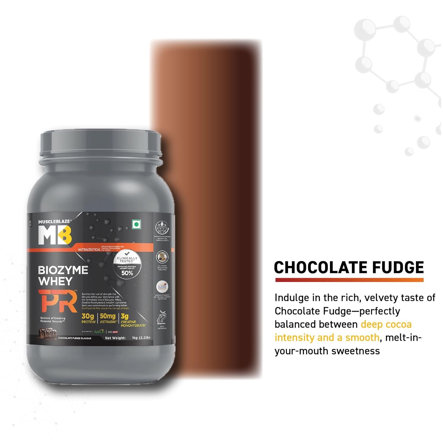 MuscleBlaze Biozyme Whey Protein PR Powder with 30g Protein, 3g Creatine Monohydrate & 50mg AstraGin (Chocolate Fudge, 1kg / 2.2lbs) | Trustified Gold Certified