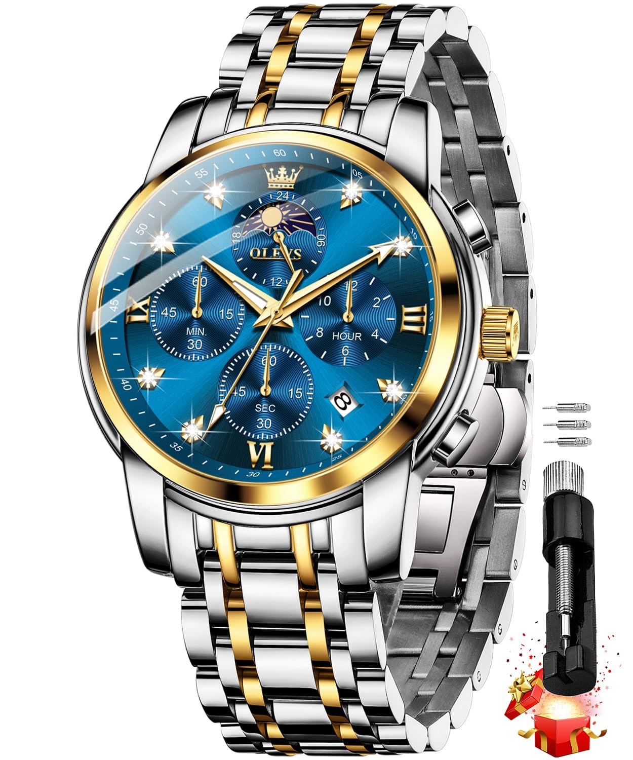 OLEVS Chronograph Watches for Men Original Analog Quartz Black Stainless Steel Chain Luxury Dual Time Zone Moon Phase Date Waterproof Men’s Wrist Watch