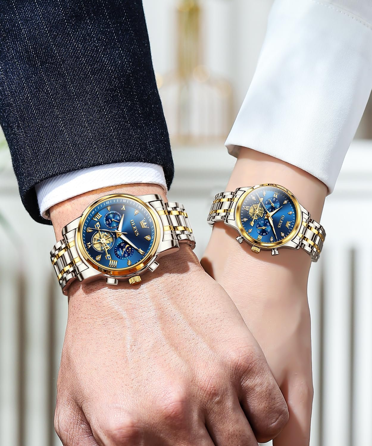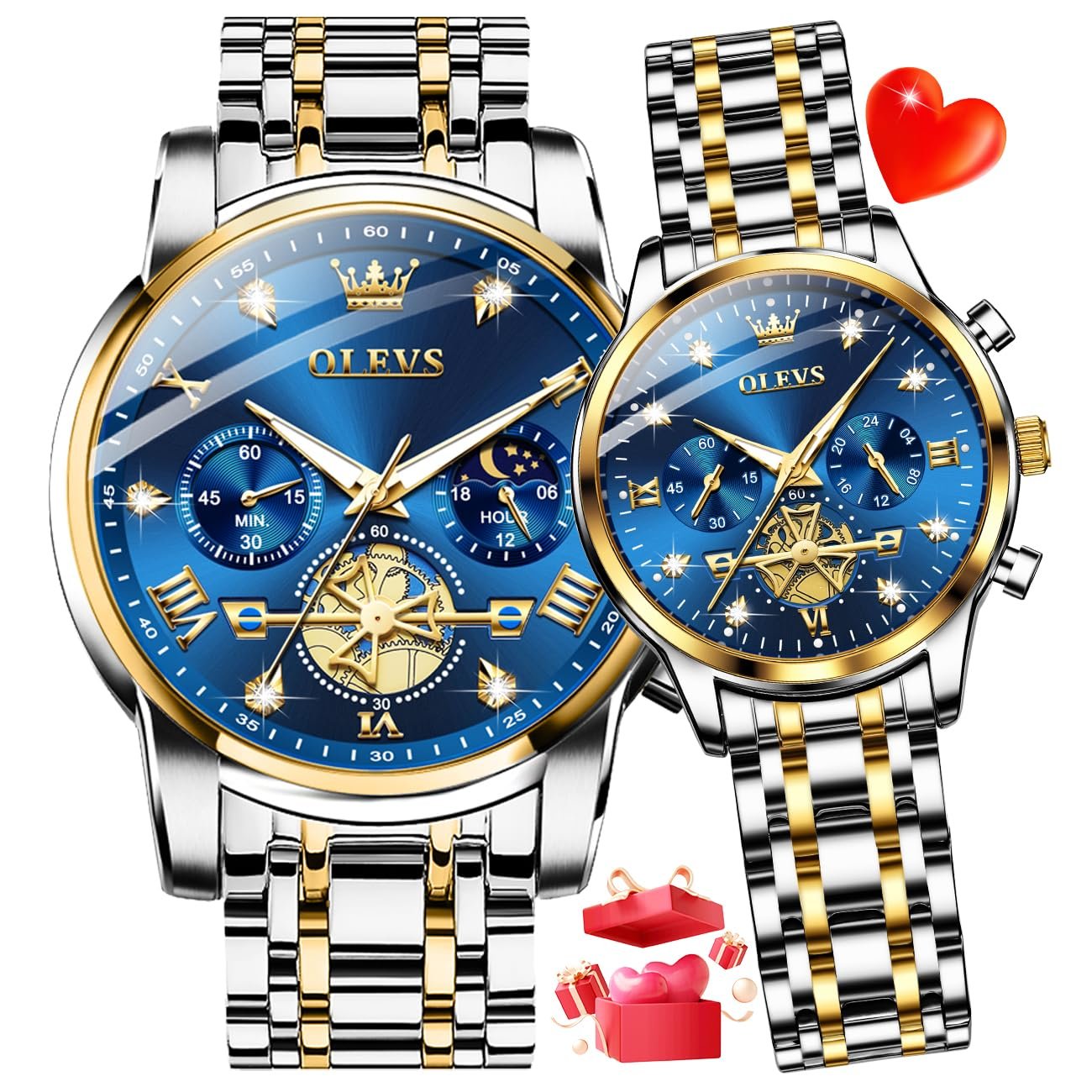 OLEVS Couple Watch Set – His & Her Matching Watches with Luxury Diamond Accents – Romantic Valentine’s Day Stainless Steel Original Quartz Men’s and Women’s Watch Lovers Set