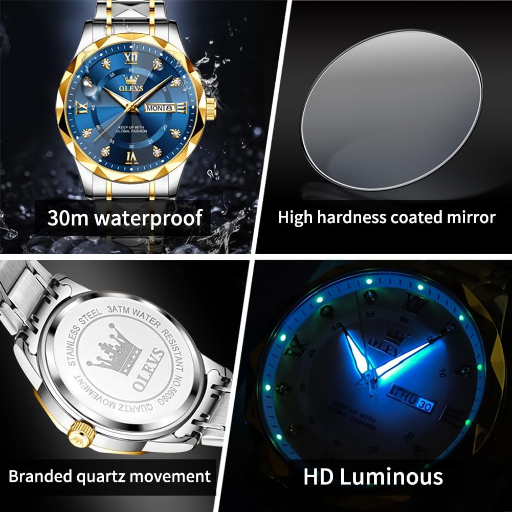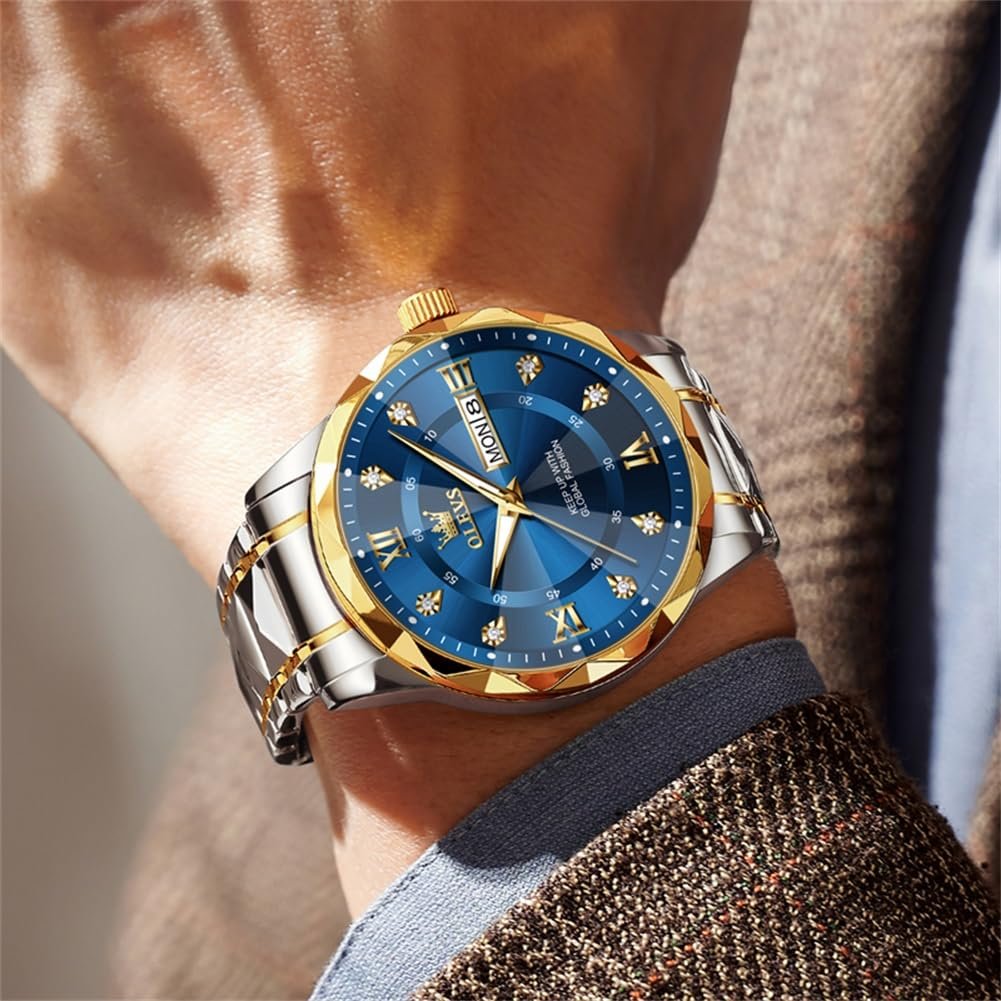 OLEVS Men’s Business Watch Gold Blue with Large Easy-Read Analog Quartz Date Display Luxury Stainless Steel Band Waterproof Luminous Hands
