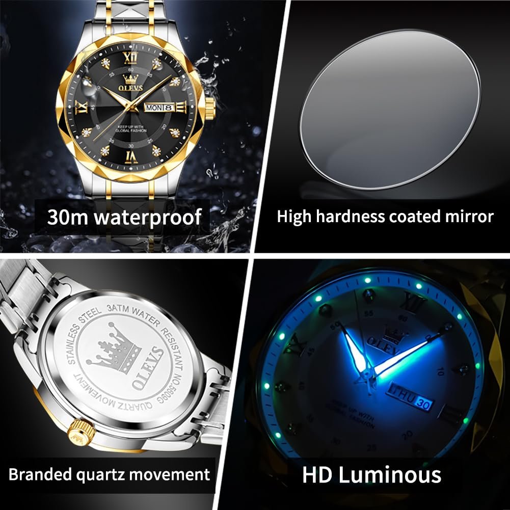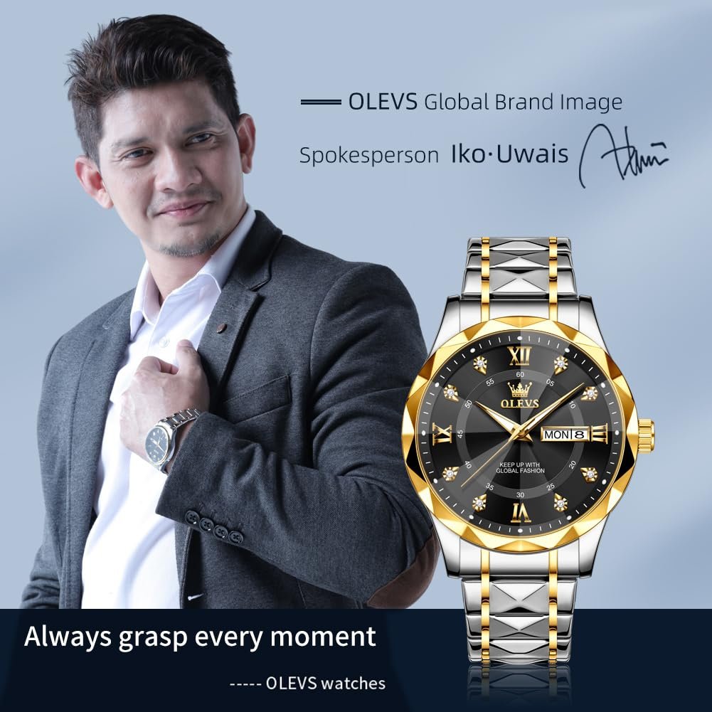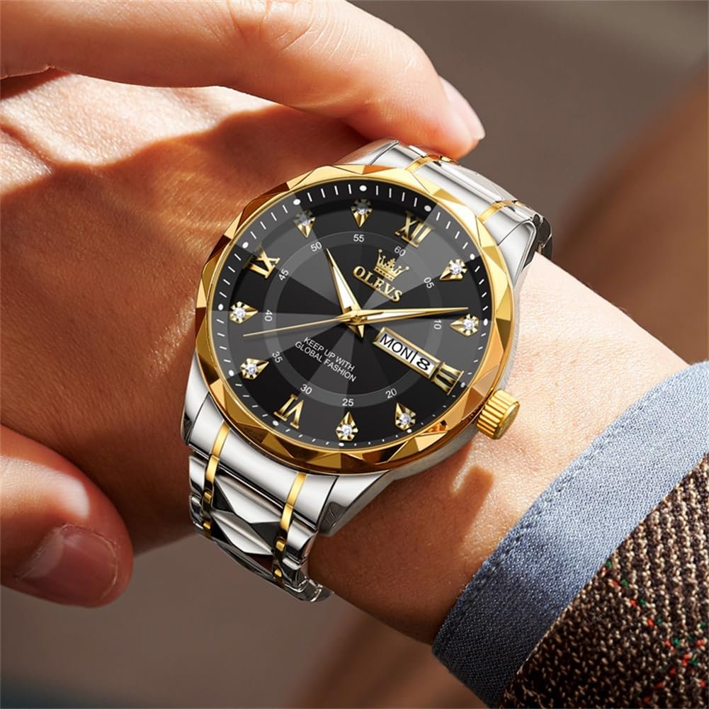 OLEVS Men’s Business Watch Gold Blue with Large Easy-Read Analog Quartz Date Display Luxury Stainless Steel Band Waterproof Luminous Hands