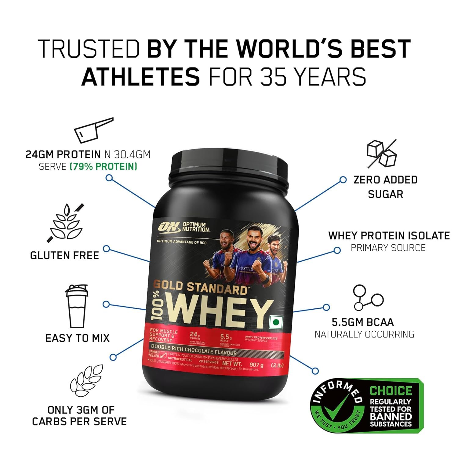 Optimum Nutrition (ON) RCB Limited Edition Gold Standard 100% Whey Protein Powder Double Rich Chocolate, 2 lb, 907 g, for Muscle Support & Recovery, Vegetarian – Primary Source Whey Protein Isolate