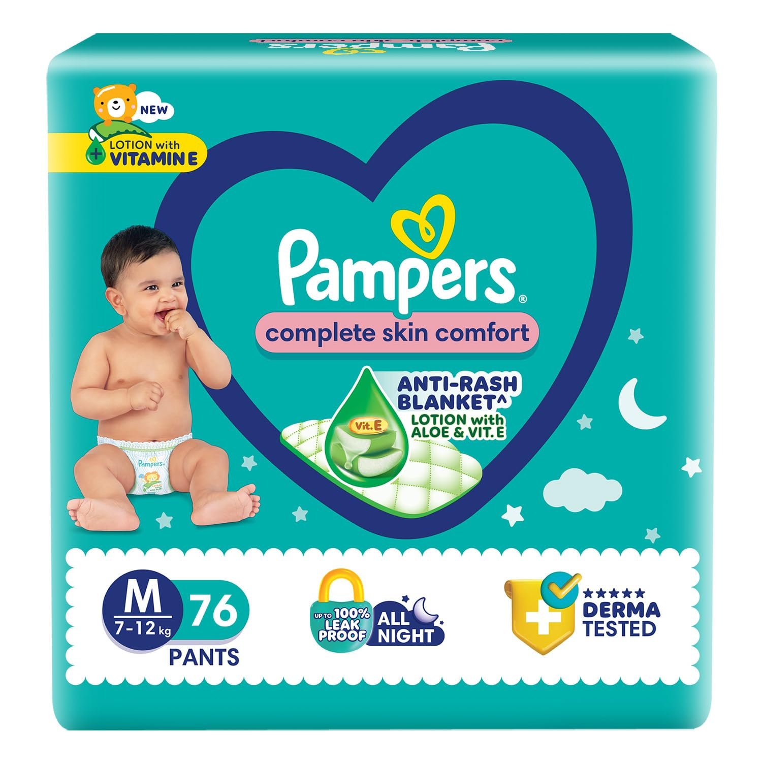 Pampers Complete Skin Comfort Pants, Anti-rash blanket, Lotion with Vitamin E & Aloe Vera, Medium (M), 76 Count, 7-12kg