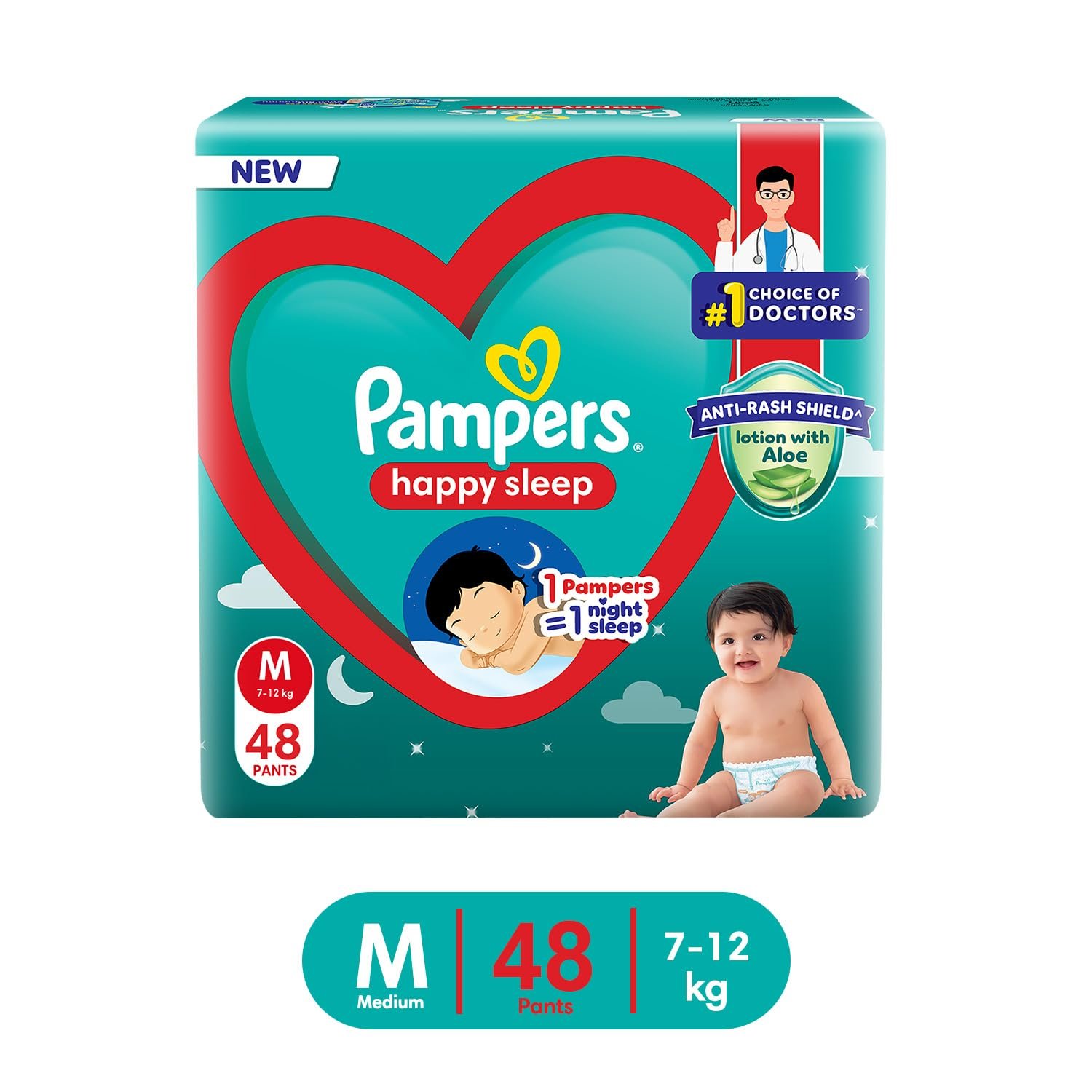 Pampers Happy Sleep Pant Style Baby Diapers, Medium (M), 48 Count, 1 Pampers = 1 Night Sleep, with Anti Rash Shield, 7-12 Kg Diapers