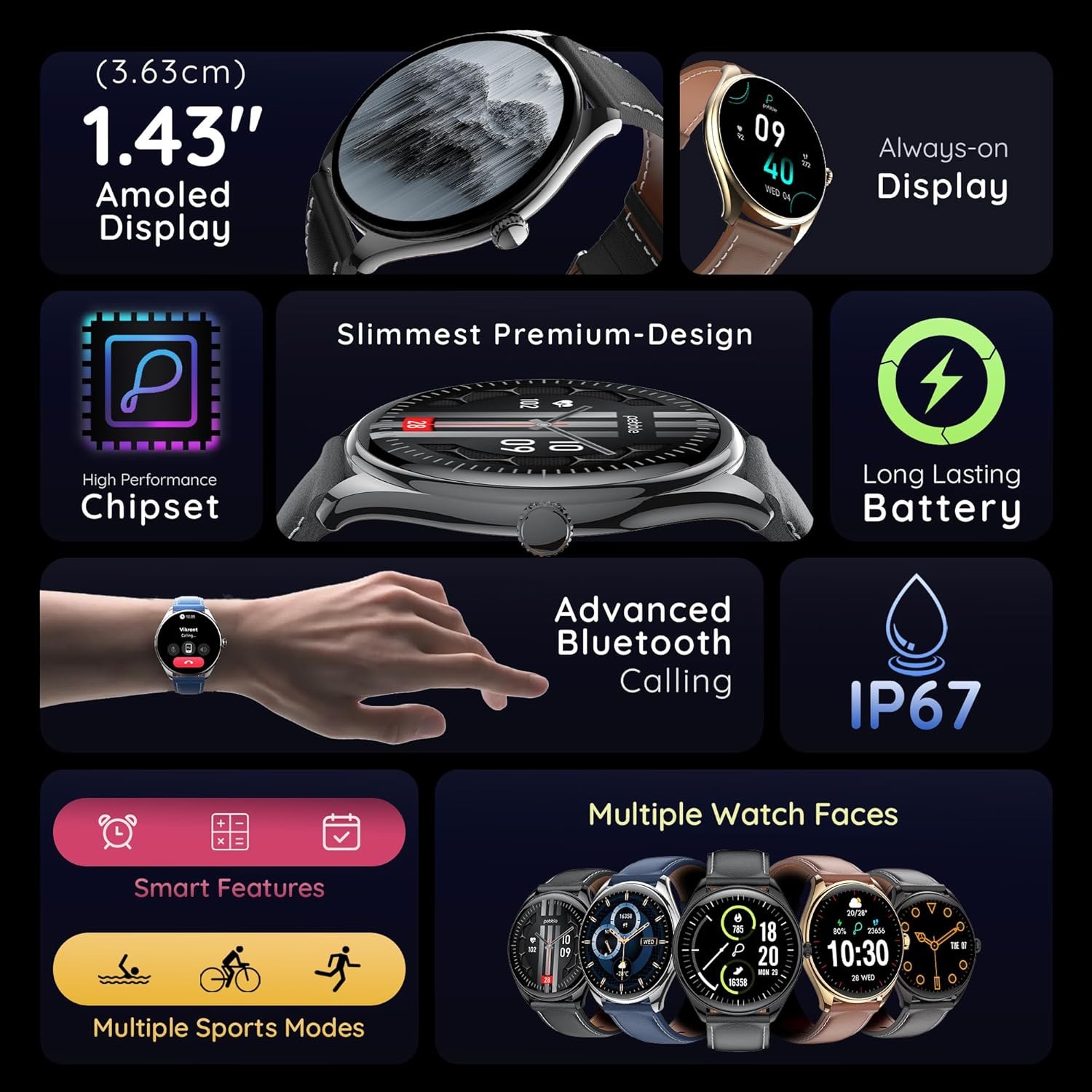 Pebble Royale Legend | 1.43″ AMOLED Display | Ultra-Slim Premium Build | Always-On Display | Bluetooth Calling | Health Tracking & Smart Features (Black)