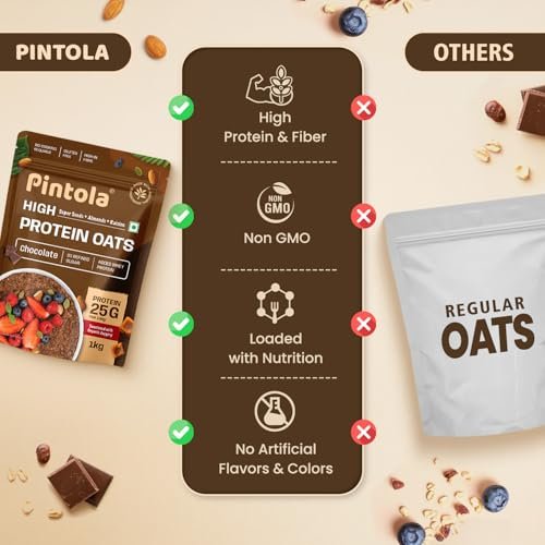 PINTOLA 25g High Protein Oats 1kg, Dark Chocolate,No Refined Sugar, with Almonds Raisin, Pumpkin and Chia Seeds, 8g Fibre, Rolled Oats for weight loss, Breakfast Cereals | Gluten Free