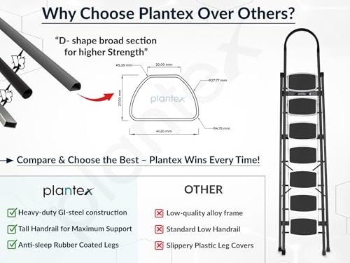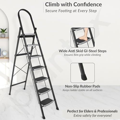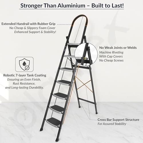 Plantex 7 Step Ladder-Foldable Steel -Wide Anti Skid Steps/5-Year Manufacturer Warranty(Grey & White)