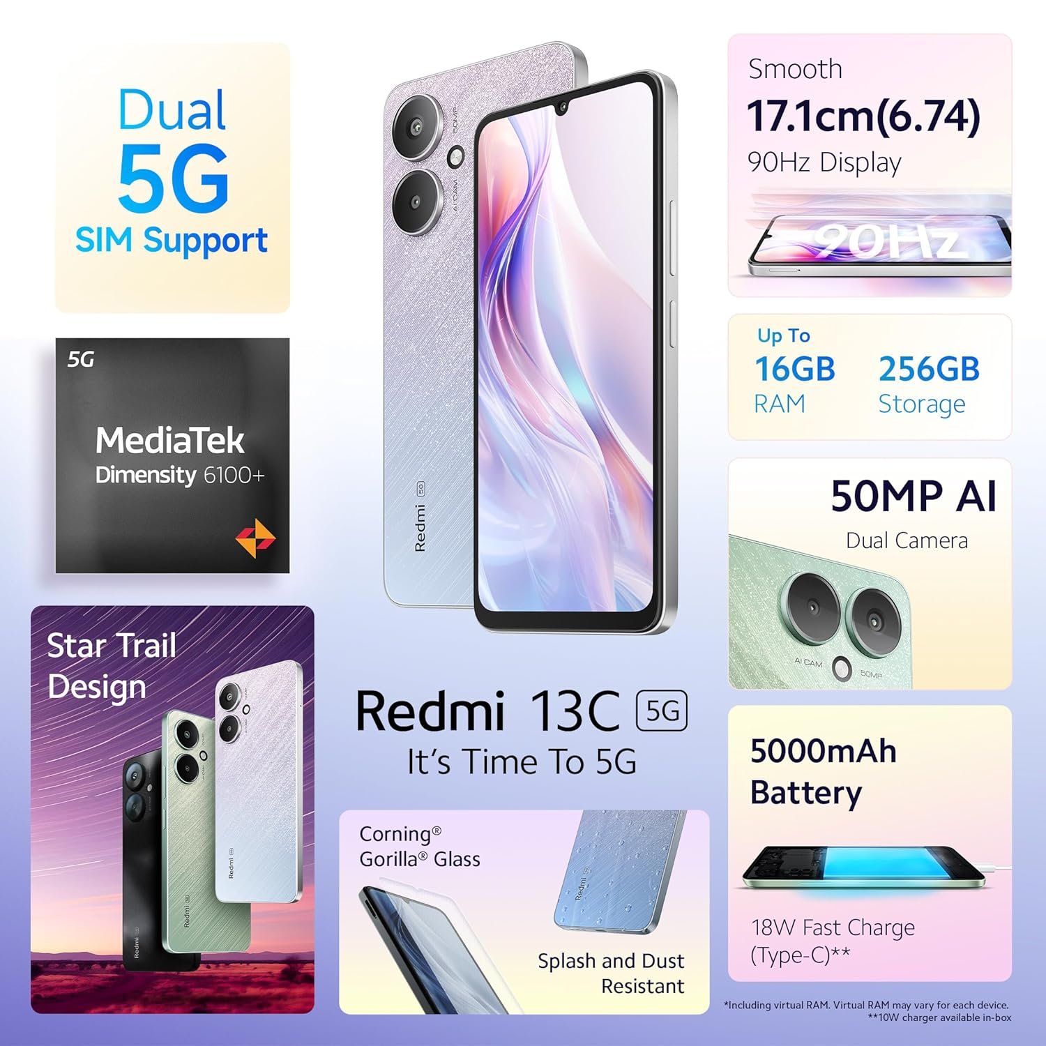 Redmi 13C 5G (Startrail Silver, 4GB RAM, 128GB Storage) | MediaTek Dimensity 6100+ 5G | 90Hz Display