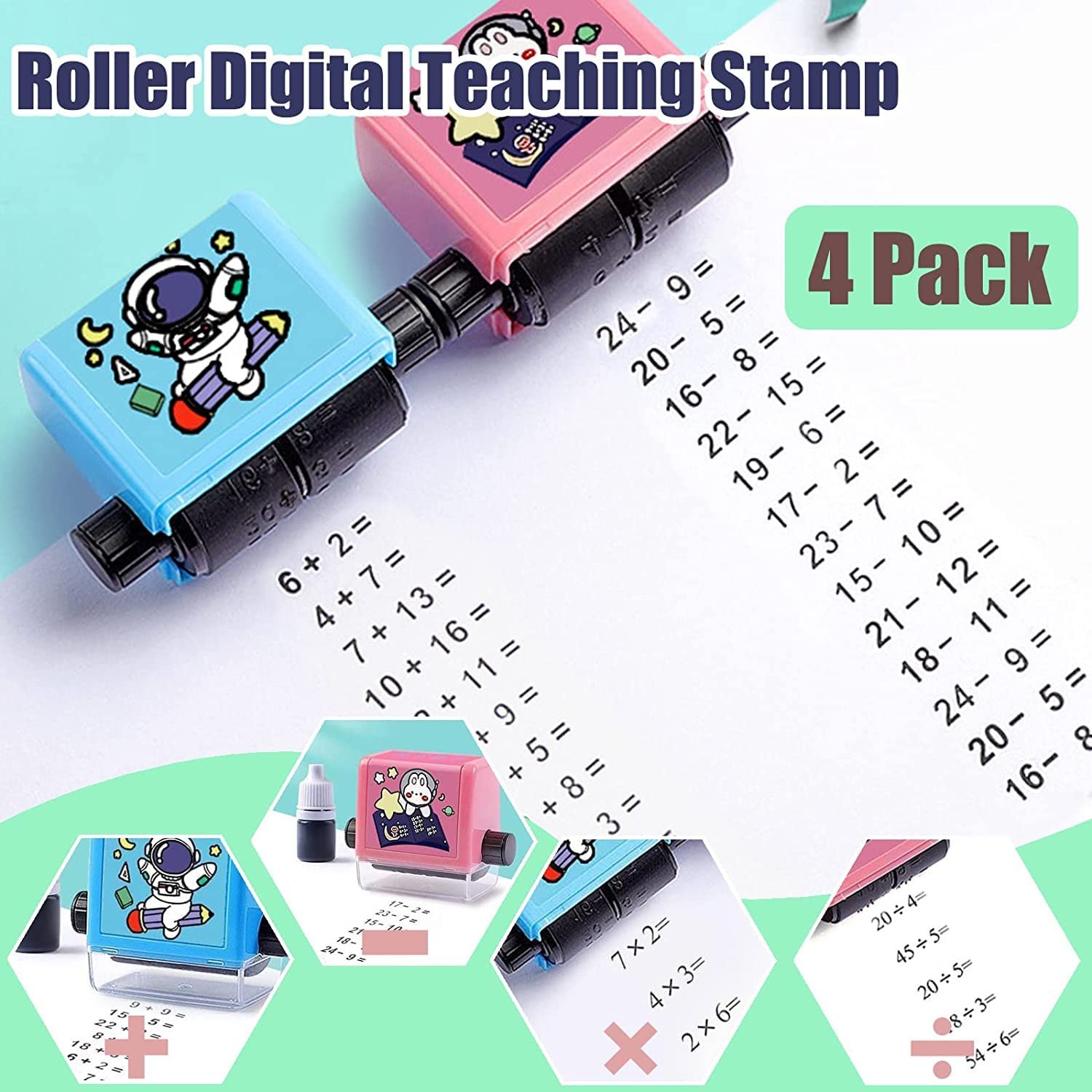 Roller Digital Teaching Stamp, Addition Seal Arithmetic Artifact, Math Roller Stamp with Ink for School Teaching Supplies (Pack of 4 Pcs).